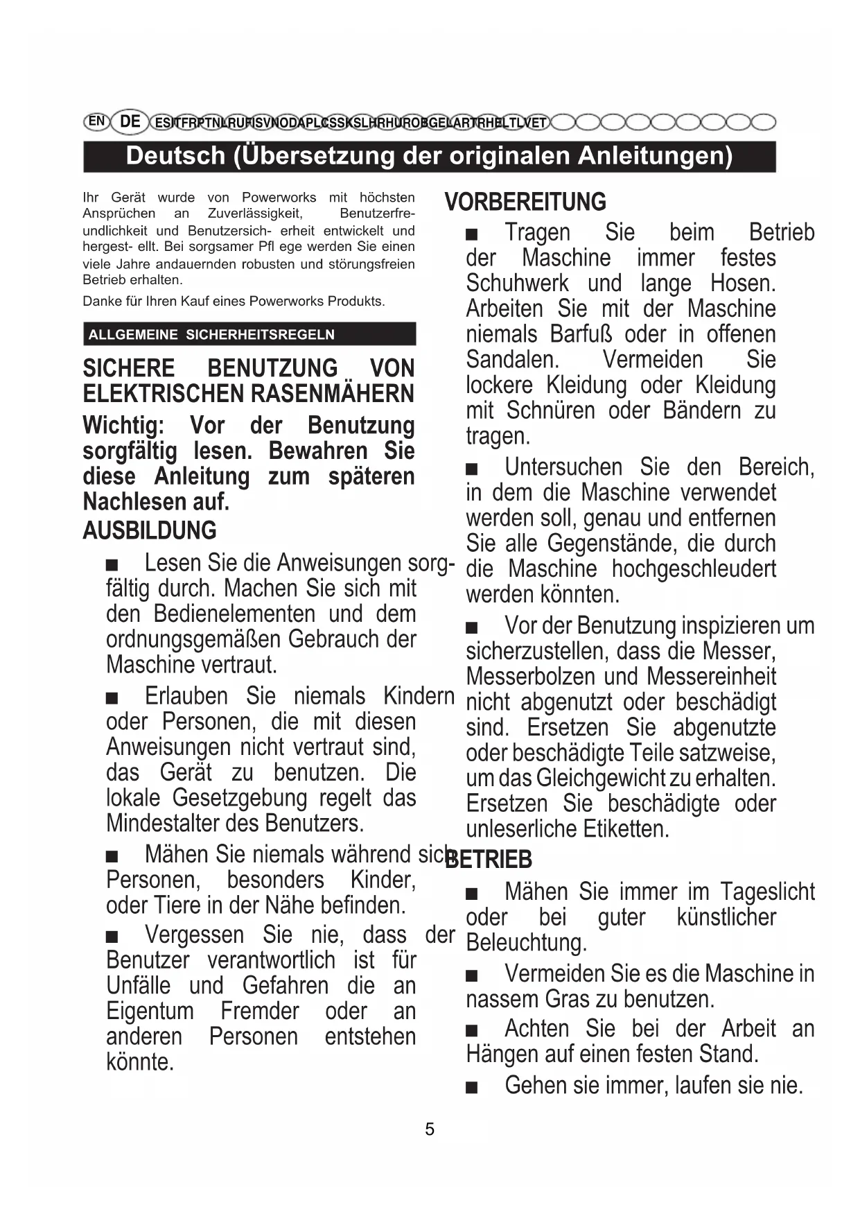 ES IT FR PT NL RU FI SV NO DA PL CS SK SL HR HU RO BG EL AR TR HE LT LV ET Ihr Gerät wurde von Powerworks mit höchsten Ansprüchen an Zuverlässigkeit, Benutzerfre- undlichkeit und Benutzersich- erheit entwickelt und hergest- ellt. Bei sorgsamer Pfl ege werden Sie einen viele Jahre andauernden robusten und störungsfreien Betrieb erhalten. Danke für Ihren Kauf eines Powerworks Produkts. ALLGEMEINE SICHERHEITSREGELN