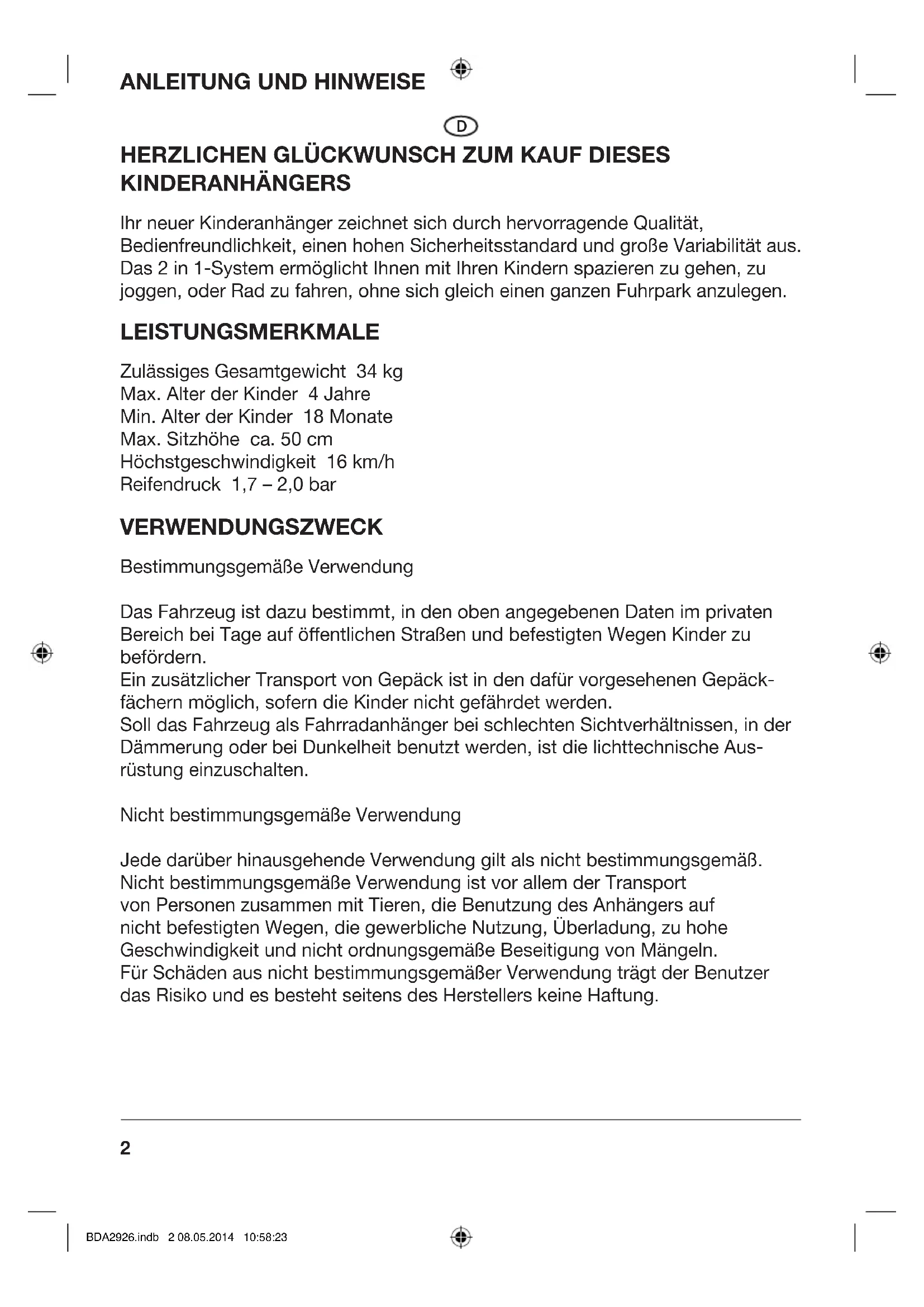 KINDERANHÄNGERS Ihr neuer Kinderanhänger zeichnet sich durch hervorragende Qualität, Bedienfreundlichkeit, einen hohen Sicherheitsstandard und große Variabilität aus. Das 2 in 1-System ermöglicht Ihnen mit Ihren Kindern spazieren zu gehen, zu joggen, oder Rad zu fahren, ohne sich gleich einen ganzen Fuhrpark anzulegen. LEISTUNGSMERKMALE Zulässiges Gesamtgewicht 34 kg Max. Alter der Kinder 4 Jahre Min. Alter der Kinder 18 Monate Max. Sitzhöhe ca. 50 cm Höchstgeschwindigkeit 16 km/h Reifendruck 1,7 – 2,0 bar VERWENDUNGSZWECK Bestimmungsgemäße Verwendung Das Fahrzeug ist dazu bestimmt, in den oben angegebenen Daten im privaten Bereich bei Tage auf öentlichen Straßen und befestigten Wegen Kinder zu befördern. Ein zusätzlicher Transport von Gepäck ist in den dafür vorgesehenen Gepäck- fächern möglich, sofern die Kinder nicht gefährdet werden. Soll das Fahrzeug als Fahrradanhänger bei schlechten Sichtverhältnissen, in der Dämmerung oder bei Dunkelheit benutzt werden, ist die lichttechnische Aus- rüstung einzuschalten. Nicht bestimmungsgemäße Verwendung Jede darüber hinausgehende Verwendung gilt als nicht bestimmungsgemäß. Nicht bestimmungsgemäße Verwendung ist vor allem der Transport von Personen zusammen mit Tieren, die Benutzung des Anhängers auf nicht befestigten Wegen, die gewerbliche Nutzung, Überladung, zu hohe Geschwindigkeit und nicht ordnungsgemäße Beseitigung von Mängeln. Für Schäden aus nicht bestimmungsgemäßer Verwendung trägt der Benutzer das Risiko und es besteht seitens des Herstellers keine Haftung.