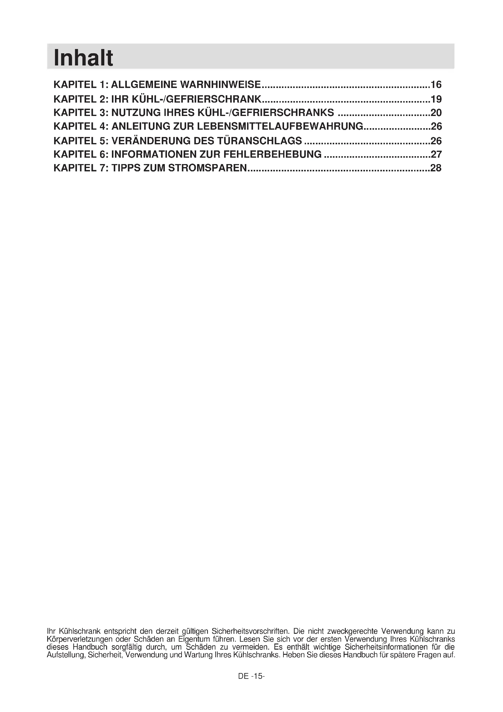 Ihr Kühlschrank entspricht den derzeit gültigen Sicherheitsvorschriften. Die nicht zweckgerechte Verwendung kann zu Körperverletzungen oder Schäden an Eigentum führen. Lesen Sie sich vor der ersten Verwendung Ihres Kühlschranks dieses Handbuch sorgfältig durch, um Schäden zu vermeiden. Es enthält wichtige Sicherheitsinformationen für die Aufstellung, Sicherheit, Verwendung und Wartung Ihres Kühlschranks. Heben Sie dieses Handbuch für spätere Fragen auf.DE -16-