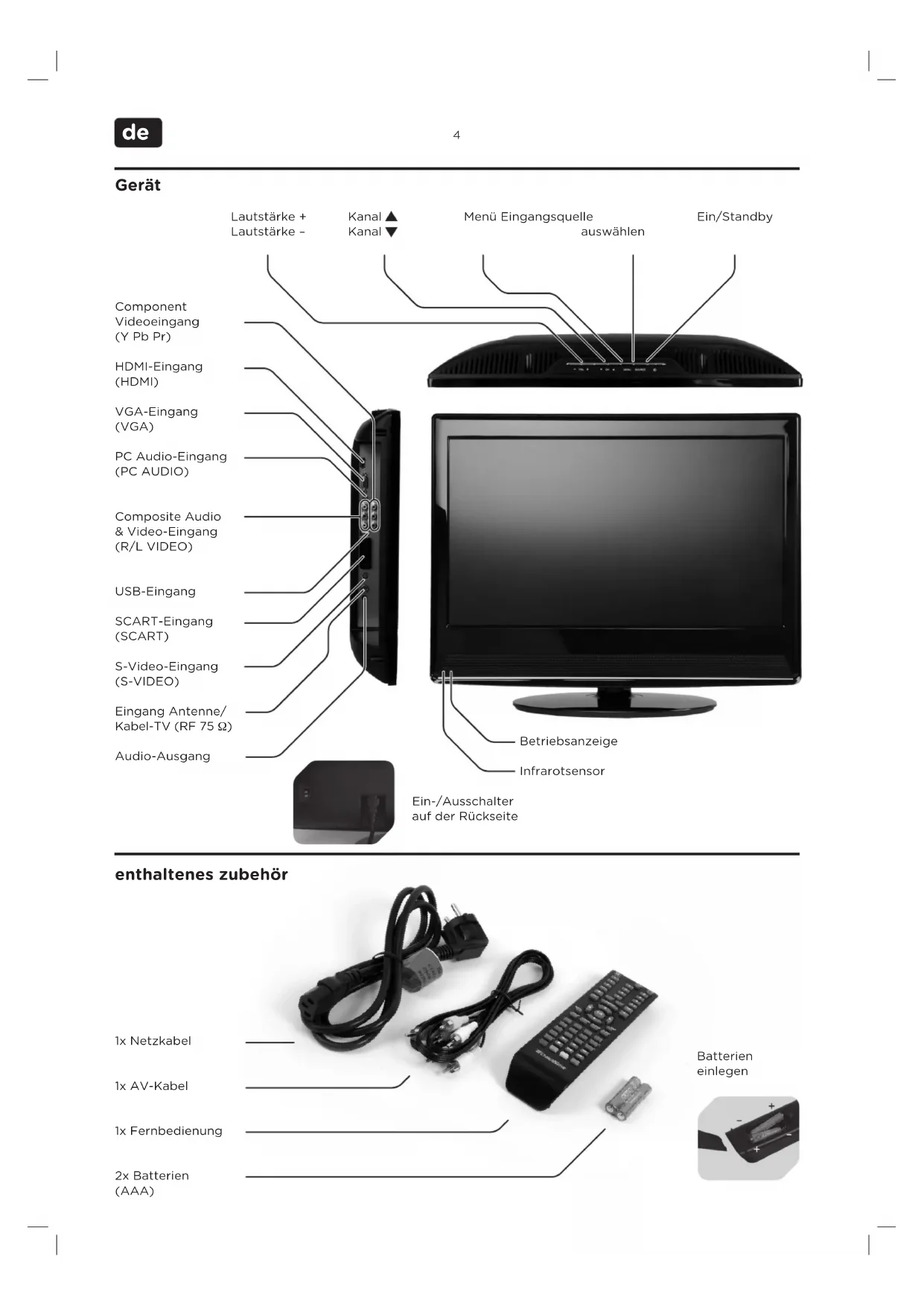 Gerät enthaltenes zubehör Lautstärke + Lautstärke – Kanal Kanal Menü Eingangsquelle auswählen Ein/Standby Betriebsanzeige Infrarotsensor HDMI-Eingang (HDMI) VGA-Eingang (VGA) PC Audio-Eingang (PC AUDIO) Component Videoeingang (Y Pb Pr) Composite Audio & Video-Eingang (R/L VIDEO) USB-Eingang S-Video-Eingang (S-VIDEO) SCART-Eingang (SCART) Eingang Antenne/ Kabel-TV (RF 75 Ω) Audio-Ausgang 1x Netzkabel 1x AV-Kabel 1x Fernbedienung 2x Batterien (AAA) Batterien einlegen Ein-/Ausschalter auf der Rückseite5