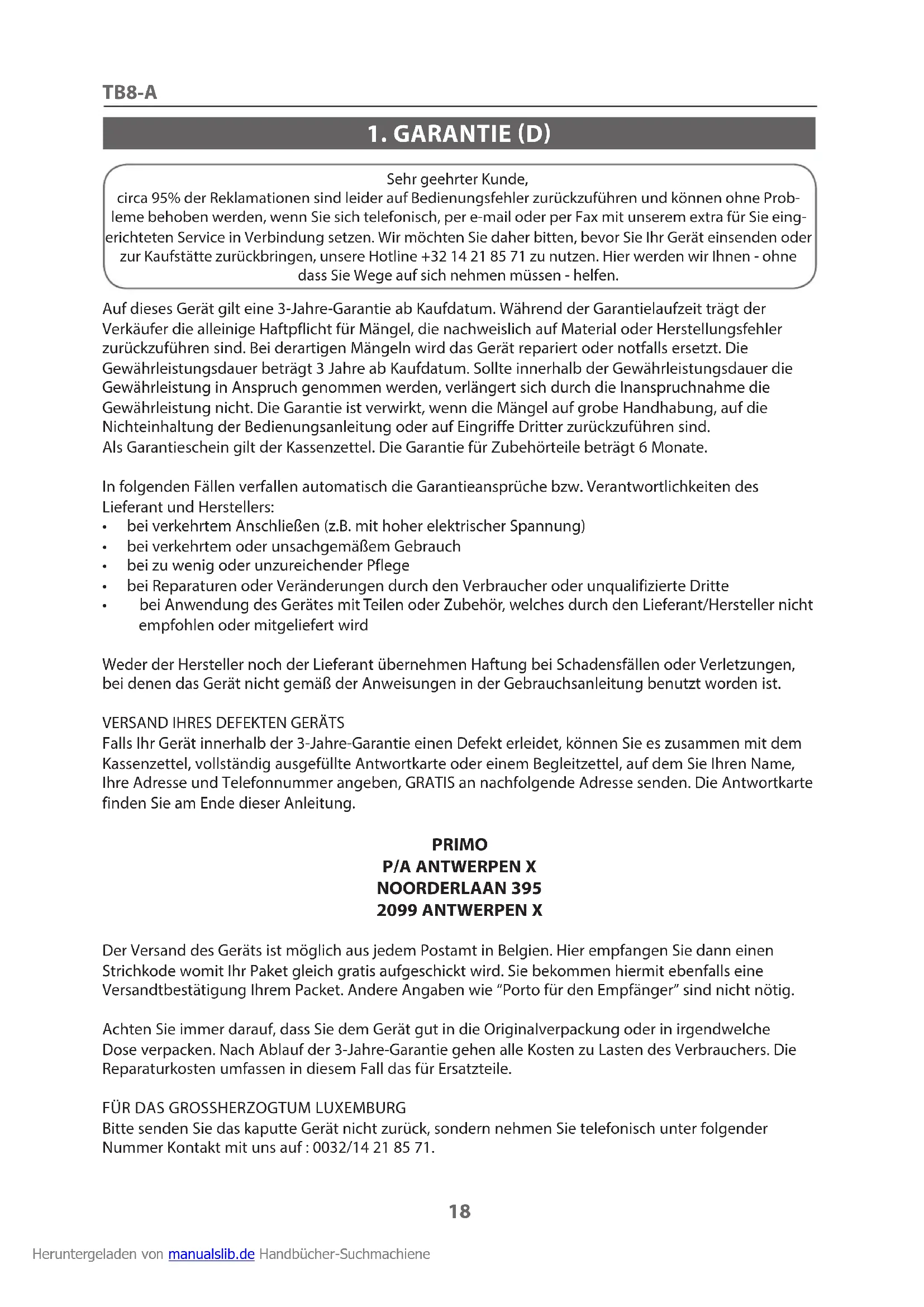 Bitte senden Sie das kaputte Gerät nicht zurück, sondern nehmen Sie telefonisch unter folgender Nummer Kontakt mit uns auf : 0032/14 21 85 71. Heruntergeladen von manualslib.de Handbücher-SuchmachieneTB8-A