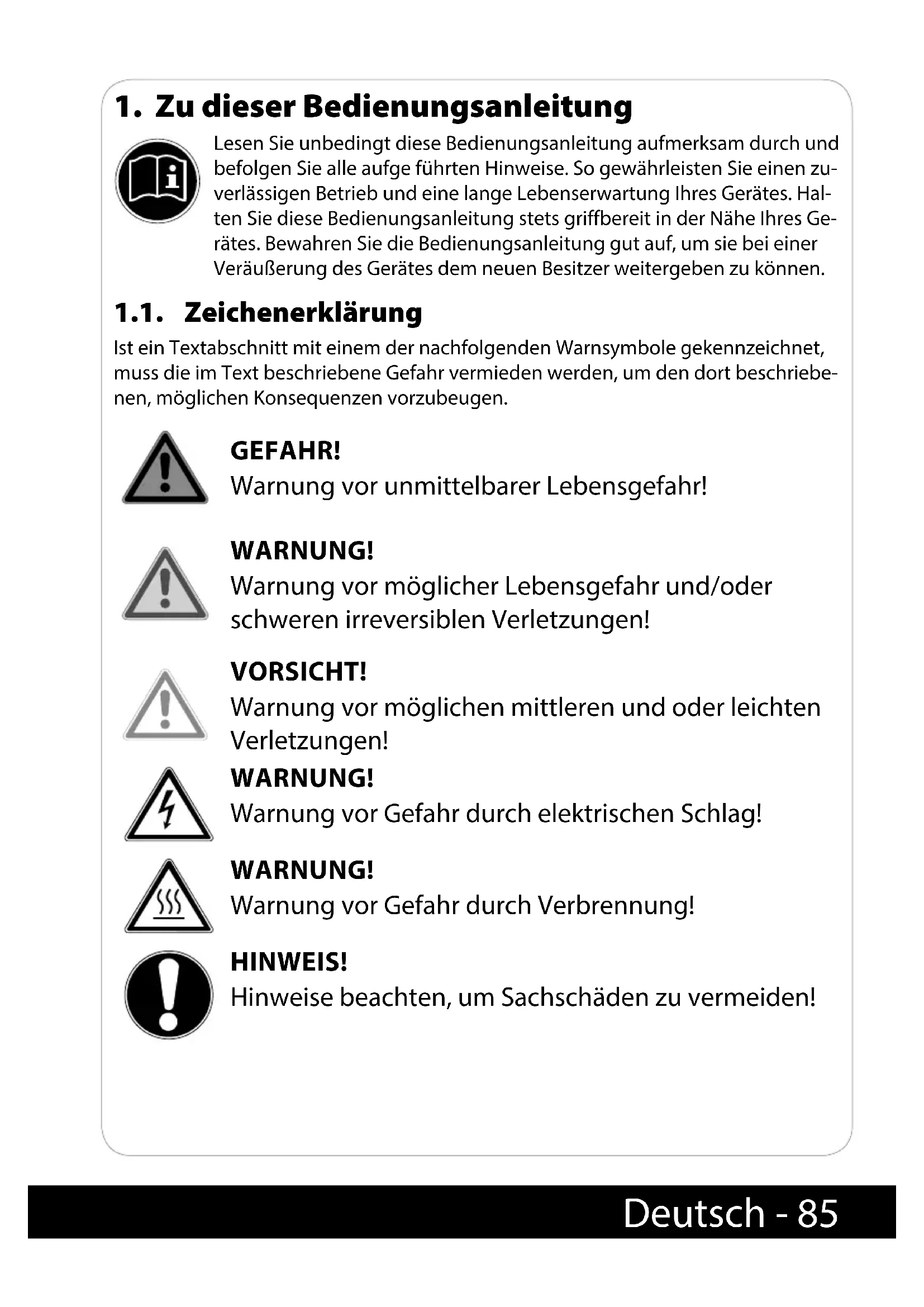 Lesen Sie unbedingt diese Bedienungsanleitung aufmerksam durch und befolgen Sie alle aufge führten Hinweise. So gewährleisten Sie einen zu- verlässigen Betrieb und eine lange Lebenserwartung Ihres Gerätes. Hal- ten Sie diese Bedienungsanleitung stets griffbereit in der Nähe Ihres Ge- rätes. Bewahren Sie die Bedienungsanleitung gut auf, um sie bei einer Veräußerung des Gerätes dem neuen Besitzer weitergeben zu können. 1.1. Zeichenerklärung Ist ein Textabschnitt mit einem der nachfolgenden Warnsymbole gekennzeichnet, muss die im Text beschriebene Gefahr vermieden werden, um den dort beschriebe- nen, möglichen Konsequenzen vorzubeugen. GEFAHR! Warnung vor unmittelbarer Lebensgefahr! WARNUNG! Warnung vor möglicher Lebensgefahr und/oder schweren irreversiblen Verletzungen! VORSICHT! Warnung vor möglichen mittleren und oder leichten Verletzungen! WARNUNG! Warnung vor Gefahr durch elektrischen Schlag! WARNUNG! Warnung vor Gefahr durch Verbrennung! HINWEIS! Hinweise beachten, um Sachschäden zu vermeiden! 16550 BE-AN MSN 5005 9606 Content RC4.indb 8516550 BE-AN MSN 5005 9606 Content RC4.indb 85 06.07.2018 11:47:2406.07.2018 11:47:2486 - Deutsch Weiterführende Information für den Gebrauch des Geräts. Hinweise in der Bedienungsanleitung beachten! Wechselstrom Benutzung in Innenräumen Geräte mit diesem Symbol sind nur für die Verwendung in Innenräu- men geeignet. Handlungsanweisung