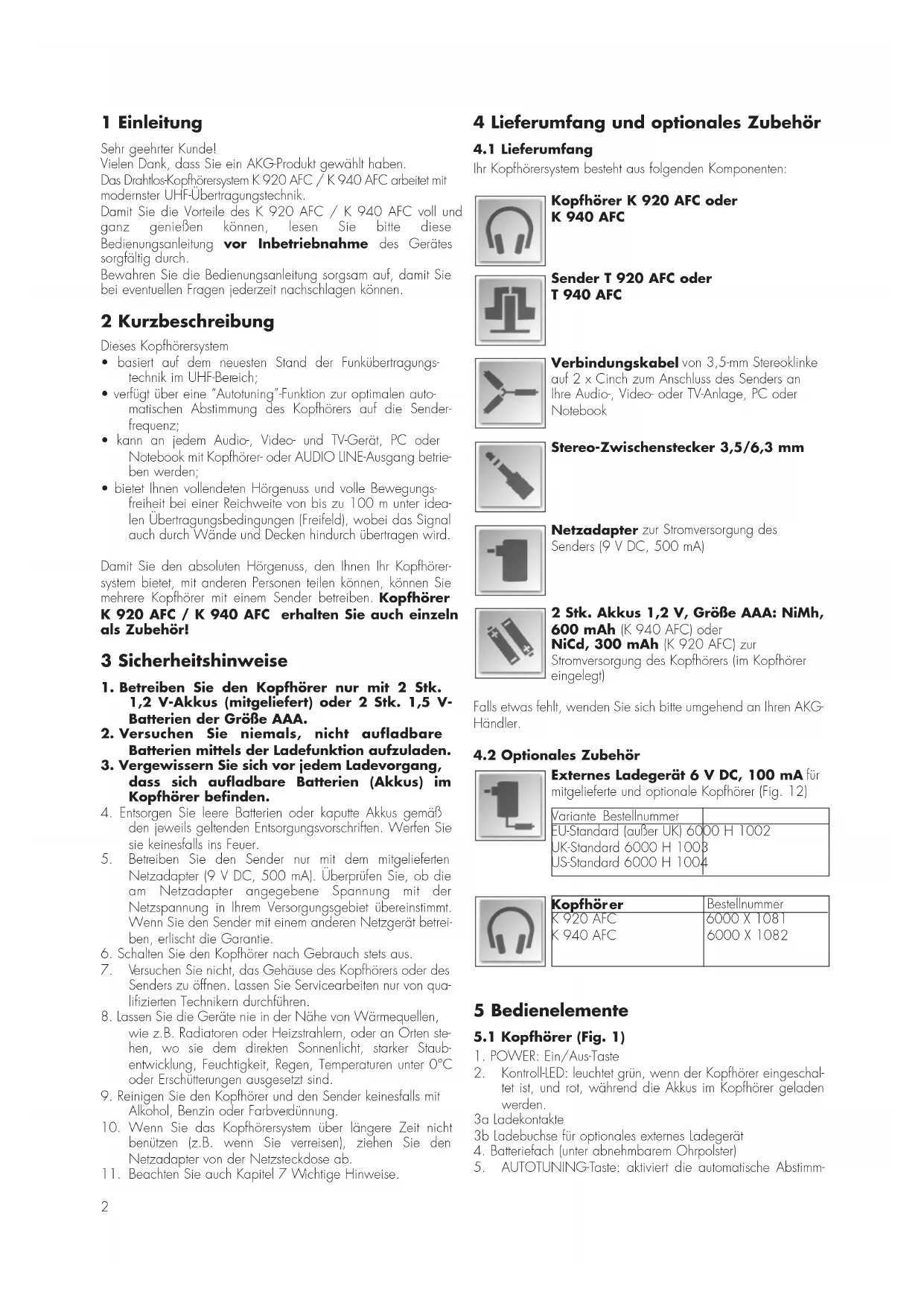 com1 Einleitung Sehr geehrter Kunde! Vielen Dank, dass Sie ein AKG-Produkt gewählt haben. Das Drahtlos-Kopfhörersystem K 920 AFC / K 940 AFC arbeitet mit modernster UHF-Übertragungstechnik. Damit Sie die Vorteile des K 920 AFC / K 940 AFC voll und ganz genießen können, lesen Sie bitte diese Bedienungsanleitung vor Inbetriebnahme des Gerätes sorgfältig durch. Bewahren Sie die Bedienungsanleitung sorgsam auf, damit Sie bei eventuellen Fragen jederzeit nachschlagen können. 2 Kurzbeschreibung Dieses Kopfhörersystem