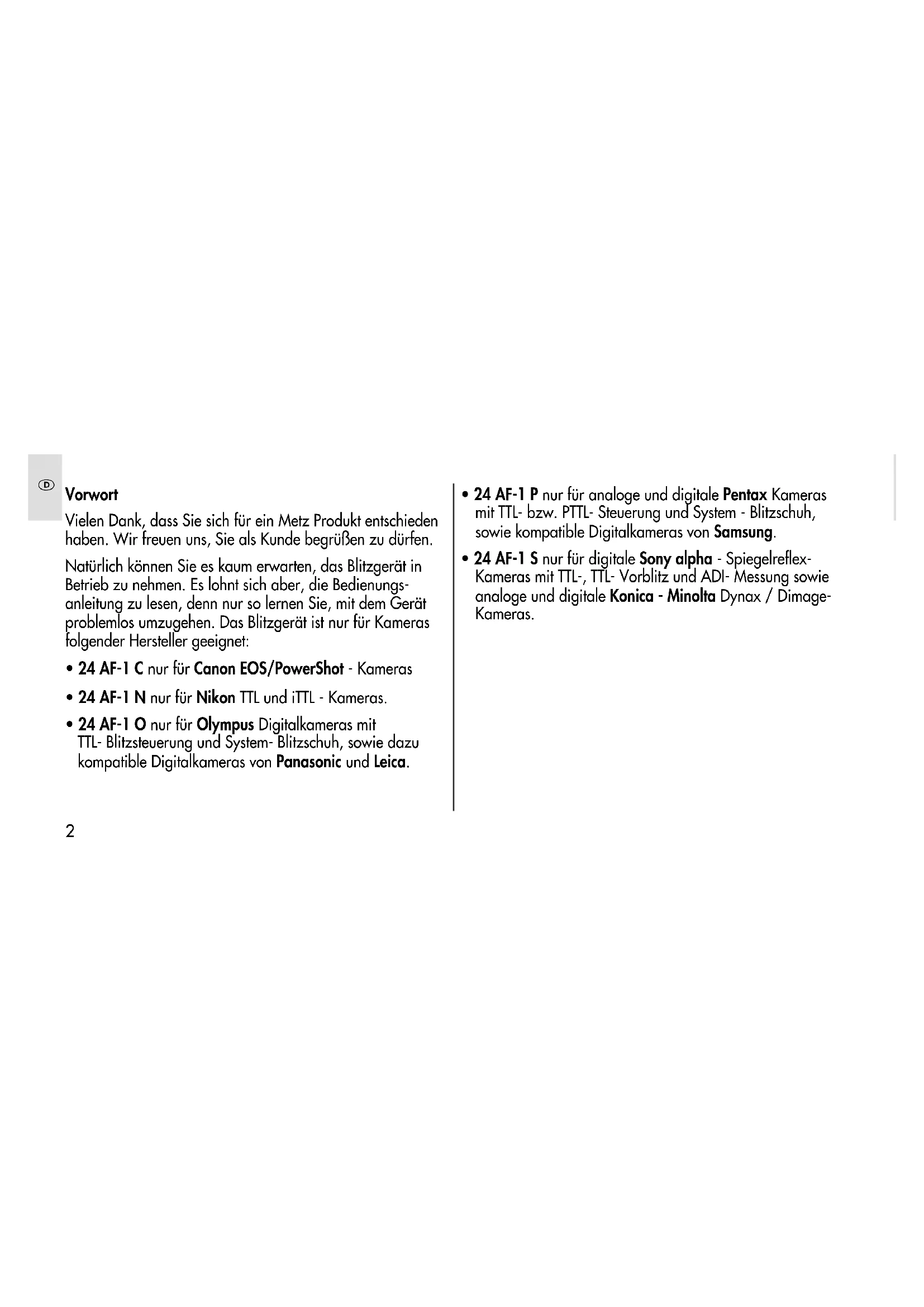 MECABLITZ 24 AF-1 C digital 24 AF-1 N digital 24 AF-1 O digital 24 AF-1 P digital 24 AF-1 S digital Bedienungsanleitung Mode d’emploi Handleiding Operating Instructions Norme per l’uso Instrucciones del manejo 709 47 0261.A2 24AF-1CNOPS 14.12.2010 13:27 Uhr Seite 1Vorwort Vielen Dank, dass Sie sich für ein Metz Produkt entschieden haben. Wir freuen uns, Sie als Kunde begrüßen zu dürfen. Natürlich können Sie es kaum erwarten, das Blitzgerät in Betrieb zu nehmen. Es lohnt sich aber, die Bedienungs- anleitung zu lesen, denn nur so lernen Sie, mit dem Gerät problemlos umzugehen. Das Blitzgerät ist nur für Kameras folgender Hersteller geeignet: