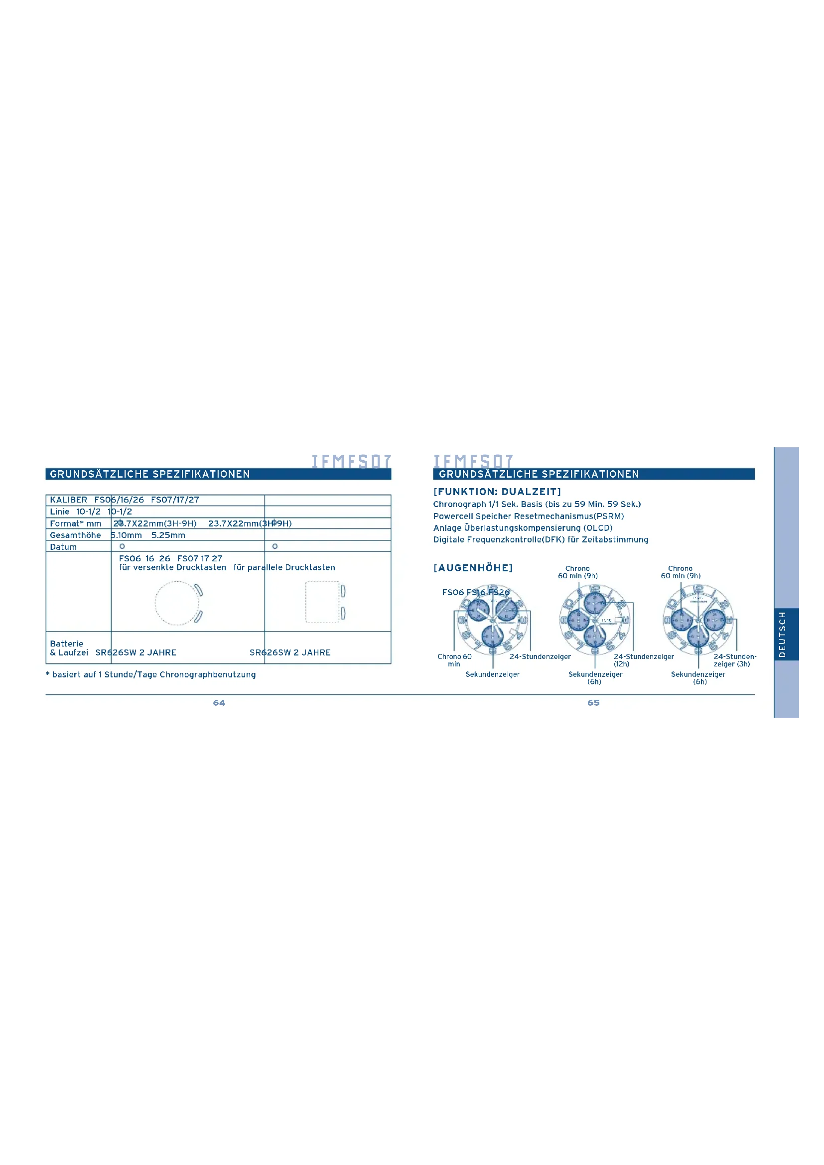 [FUNKTION: DUALZEIT] Chronograph 1/1 Sek. Basis (bis zu 59 Min. 59 Sek.) Powercell Speicher Resetmechanismus(PSRM) Anlage Überlastungskompensierung (OLCD) Digitale Frequenzkontrolle(DFK) für Zeitabstimmung FS16 FS26 FS06 [AUGENHÖHE] FS06 FS16 FS26 Chrono 60 min Sekundenzeiger 24-Stundenzeiger Chrono 60 min (9h) Chrono 60 min (9h) 24-Stundenzeiger (12h) Sekundenzeiger (6h) Sekundenzeiger (6h) 24-Stunden- zeiger (3h) IFMFS07