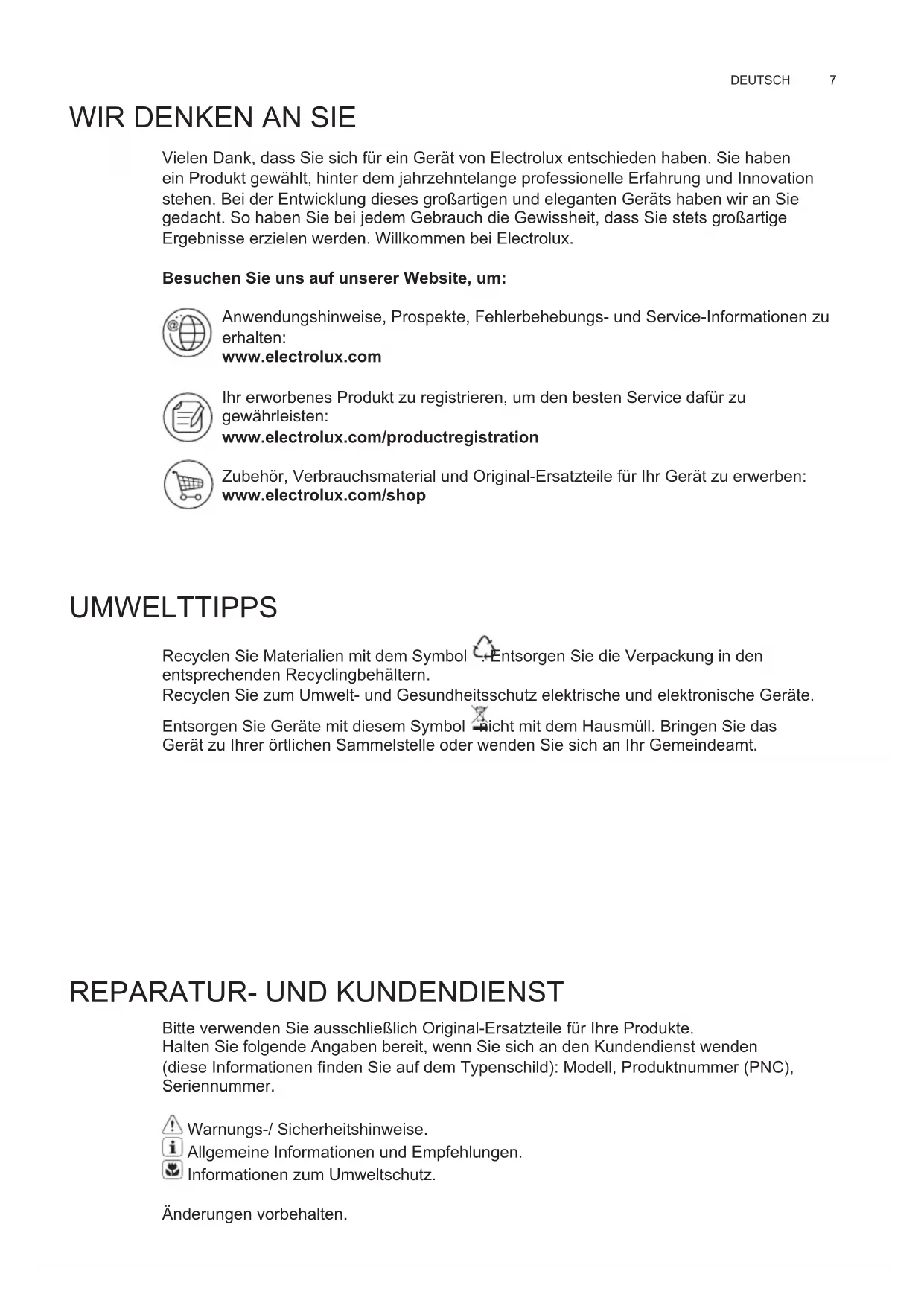Bitte verwenden Sie ausschließlich Original-Ersatzteile für Ihre Produkte. Halten Sie folgende Angaben bereit, wenn Sie sich an den Kundendienst wenden (diese Informationen fi nden Sie auf dem Typenschild): Modell, Produktnummer (PNC), Seriennummer. Warnungs-/ Sicherheitshinweise. Allgemeine Informationen und Empfehlungen. Informationen zum Umweltschutz. Änderungen vorbehalten. DE GEBRAUCHSANLEITUNGwww.electrolux.com