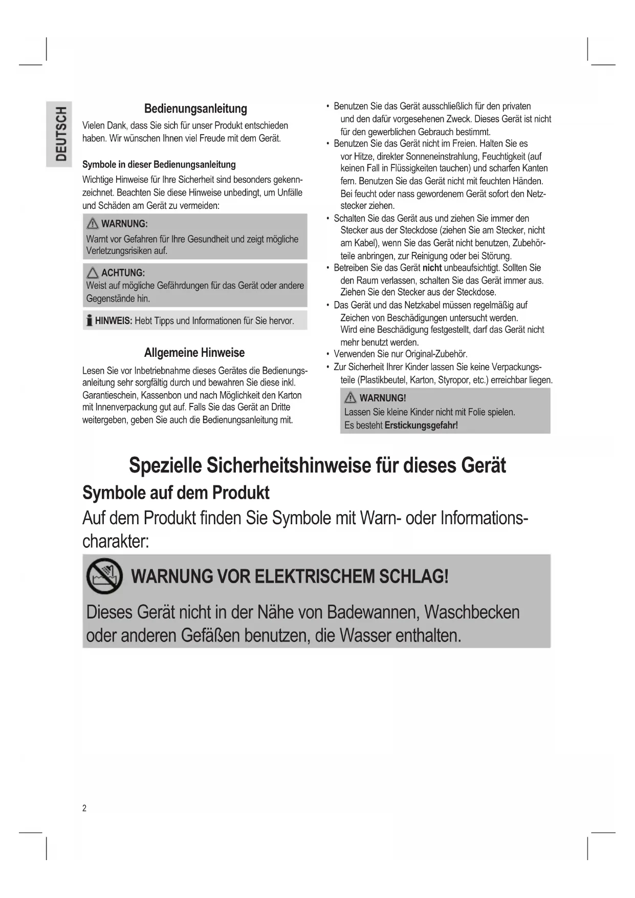 - Zur Sicherheit Ihrer Kinder lassen Sie keine Verpackungs- teile (Plastikbeutel, Karton, Styropor, etc.) erreichbar liegen. WARNUNG! Lassen Sie kleine Kinder nicht mit Folie spielen. Es besteht Erstickungsgefahr! Bedienungsanleitung Vielen Dank, dass Sie sich für unser Produkt entschieden haben. Wir wünschen Ihnen viel Freude mit dem Gerät. Symbole in dieser Bedienungsanleitung Wichtige Hinweise für Ihre Sicherheit sind besonders gekenn- zeichnet. Beachten Sie diese Hinweise unbedingt, um Unfälle und Schäden am Gerät zu vermeiden: WARNUNG: Warnt vor Gefahren für Ihre Gesundheit und zeigt mögliche Verletzungsrisiken auf. ACHTUNG: Weist auf mögliche Gefährdungen für das Gerät oder andere Gegenstände hin. HINWEIS: Hebt Tipps und Informationen für Sie hervor. Allgemeine Hinweise Lesen Sie vor Inbetriebnahme dieses Gerätes die Bedienungs- anleitung sehr sorgfältig durch und bewahren Sie diese inkl. Garantieschein, Kassenbon und nach Möglichkeit den Karton mit Innenverpackung gut auf. Falls Sie das Gerät an Dritte weitergeben, geben Sie auch die Bedienungsanleitung mit. Spezielle Sicherheitshinweise für dieses Gerät Symbole auf dem Produkt Auf dem Produkt nden Sie Symbole mit Warn- oder Informations- charakter: WARNUNG VOR ELEKTRISCHEM SCHLAG! Dieses Gerät nicht in der Nähe von Badewannen, Waschbecken oder anderen Gefäßen benutzen, die Wasser enthalten.3 WARNUNG: