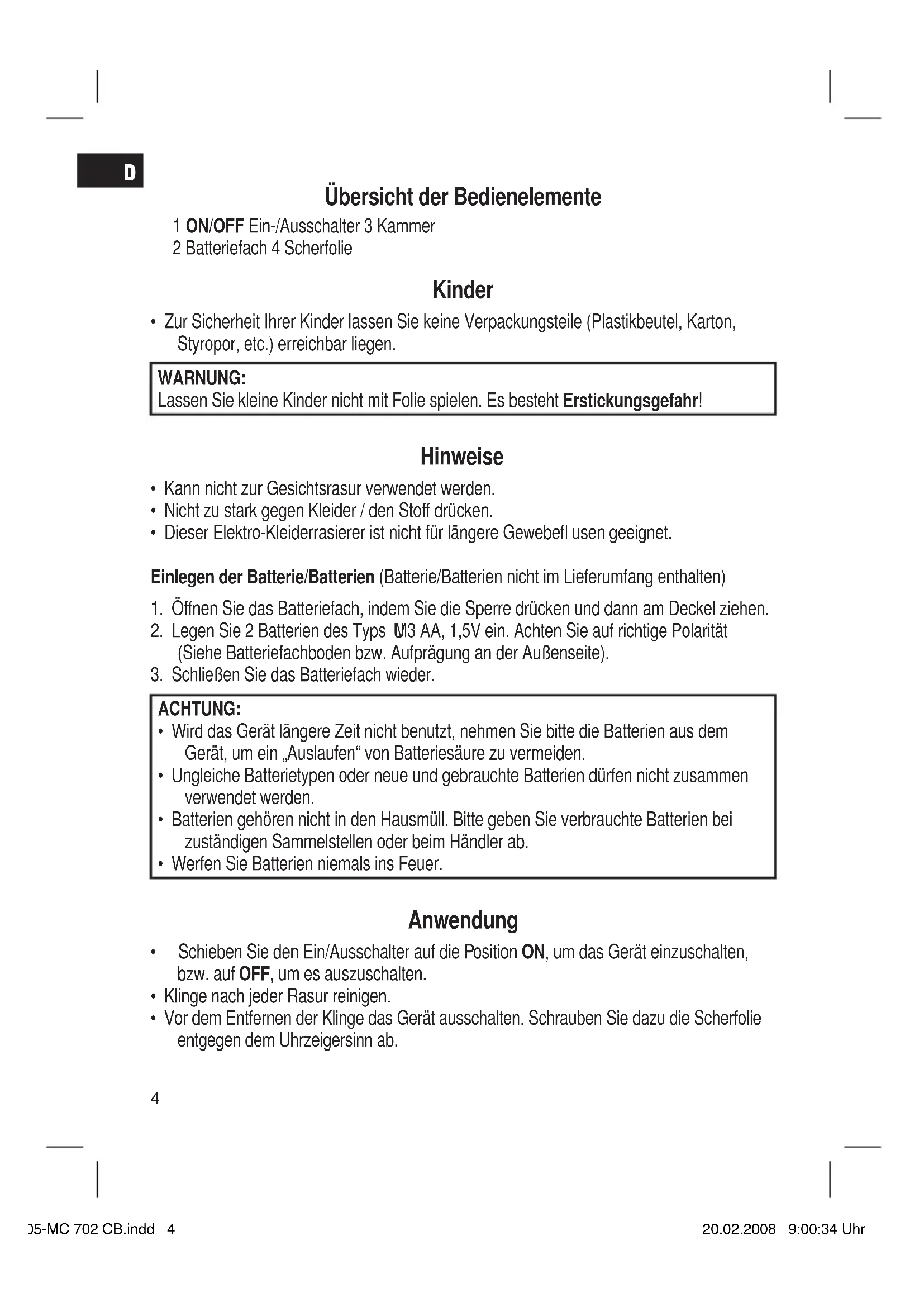 Übersicht der Bedienelemente 1 ON/OFF Ein-/Ausschalter 3 Kammer 2 Batteriefach 4 Scherfolie Kinder