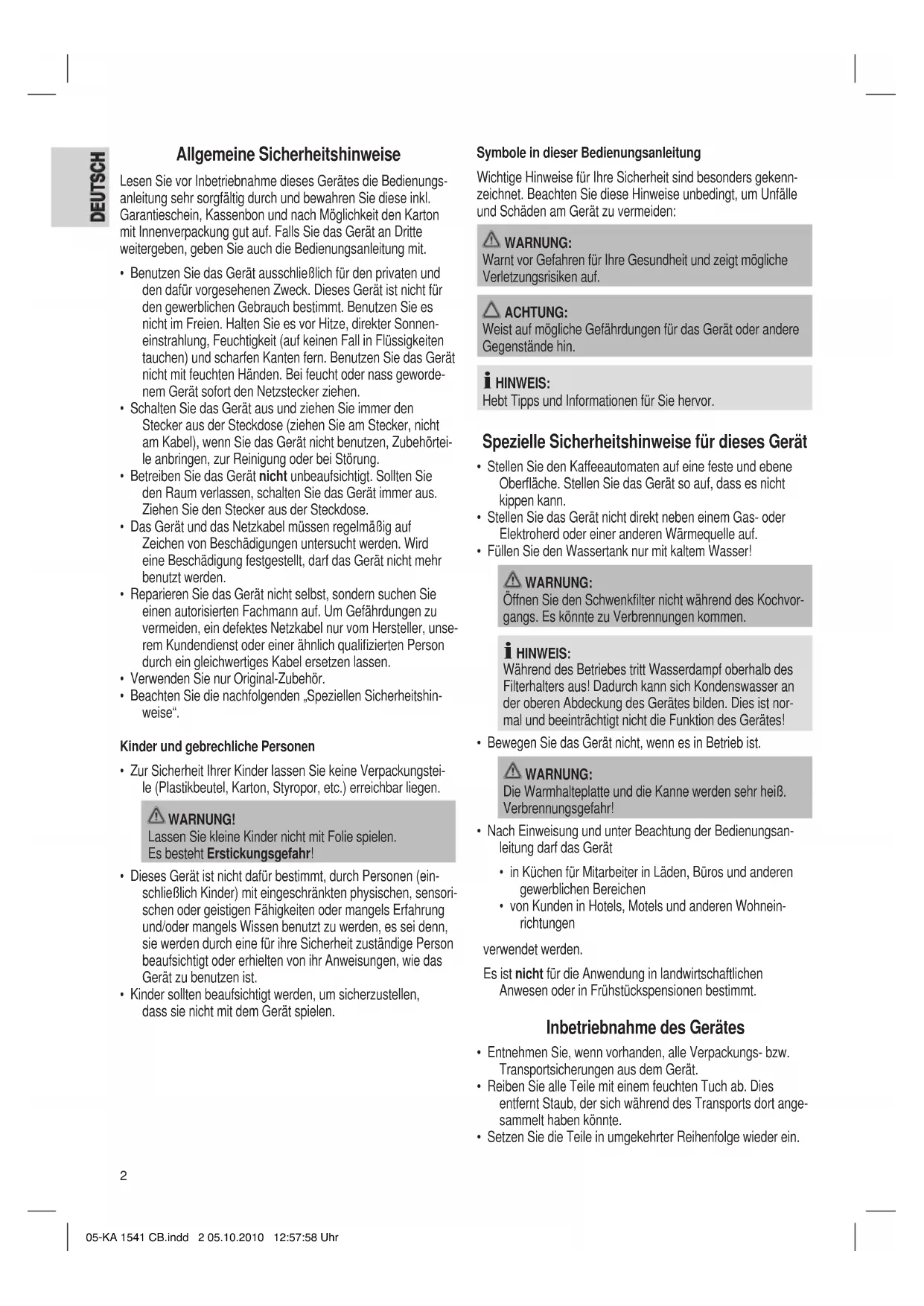 - Setzen Sie die Teile in umgekehrter Reihenfolge wieder ein. 05-KA 1541 CB.indd 2 05.10.2010 12:57:58 Uhr3 DEUTSCH HINWEIS: Lassen Sie bitte vor dem 1. Aufbrühen von Kaffee für 2-3 Durchgänge Wasser zur Reinigung durch das Gerät laufen. Elektrischer Anschluss HINWEIS: Achten Sie darauf, dass das Gerät ausgeschaltet ist. Der Schalter muss auf „0“ stehen. Stecken Sie den Netzstecker in eine vorschriftsmäßig installierte Schutzkontakt Steckdose 230 V, 50 Hz. Die Angaben hierzu nden Sie auf dem Typenschild des Gerätes. Betrieb