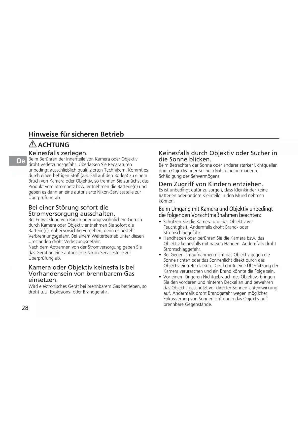 Hinweise für sicheren Betrieb ACHTUNG Keinesfalls zerlegen. Beim Berühren der Innenteile von Kamera oder Objektiv droht Verletzungsgefahr. Überlassen Sie Reparaturen unbedingt ausschließlich qualifizierten Technikern. Kommt es durch einen heftigen Stoß (z.B. Fall auf den Boden) zu einem Bruch von Kamera oder Objektiv, so trennen Sie zunächst das Produkt vom Stromnetz bzw. entnehmen die Batterie(n) und geben es dann an eine autorisierte Nikon-Servicestelle zur Überprüfung ab. Bei einer Störung sofort die Stromversorgung ausschalten. Bei Entwicklung von Rauch oder ungewöhnlichem Geruch durch Kamera oder Objektiv entnehmen Sie sofort die Batterie(n); dabei vorsichtig vorgehen, denn es besteht Verbrennungsgefahr. Bei einem Weiterbetrieb unter diesen Umständen droht Verletzungsgefahr. Nach dem Abtrennen von der Stromversorgung geben Sie das Gerät an eine autorisierte Nikon-Servicestelle zur Überprüfung ab. Kamera oder Objektiv keinesfalls bei Vorhandensein von brennbarem Gas einsetzen. Wird elektronisches Gerät bei brennbarem Gas betrieben, so droht u.U. Explosions- oder Brandgefahr. Keinesfalls durch Objektiv oder Sucher in die Sonne blicken. Beim Betrachten der Sonne oder anderer starker Lichtquellen durch Objektiv oder Sucher droht eine permanente Schädigung des Sehvermögens. Dem Zugriff von Kindern entziehen. Es ist unbedingt dafür zu sorgen, dass Kleinkinder keine Batterien oder andere Kleinteile in den Mund nehmen können. Beim Umgang mit Kamera und Objektiv unbedingt die folgenden Vorsichtmaßnahmen beachten: