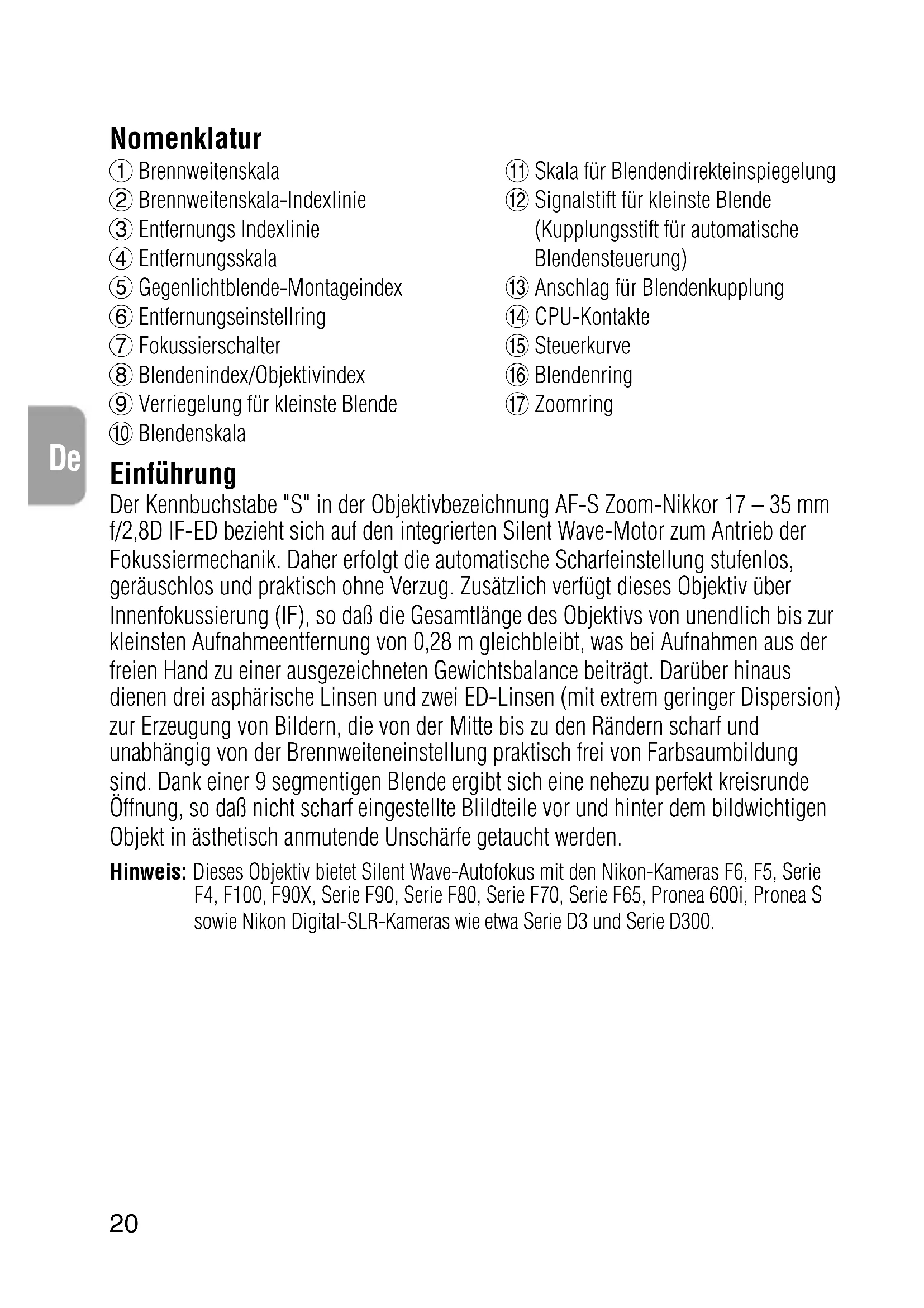 Zoomring Einführung Der Kennbuchstabe "S" in der Objektivbezeichnung AF-S Zoom-Nikkor 17 – 35 mm f/2,8D IF-ED bezieht sich auf den integrierten Silent Wave-Motor zum Antrieb der Fokussiermechanik. Daher erfolgt die automatische Scharfeinstellung stufenlos, geräuschlos und praktisch ohne Verzug. Zusätzlich verfügt dieses Objektiv über Innenfokussierung (IF), so daß die Gesamtlänge des Objektivs von unendlich bis zur kleinsten Aufnahmeentfernung von 0,28 m gleichbleibt, was bei Aufnahmen aus der freien Hand zu einer ausgezeichneten Gewichtsbalance beiträgt. Darüber hinaus dienen drei asphärische Linsen und zwei ED-Linsen (mit extrem geringer Dispersion) zur Erzeugung von Bildern, die von der Mitte bis zu den Rändern scharf und unabhängig von der Brennweiteneinstellung praktisch frei von Farbsaumbildung sind. Dank einer 9 segmentigen Blende ergibt sich eine nehezu perfekt kreisrunde Öffnung, so daß nicht scharf eingestellte Blildteile vor und hinter dem bildwichtigen Objekt in ästhetisch anmutende Unschärfe getaucht werden. Hinweis: Dieses Objektiv bietet Silent Wave-Autofokus mit den Nikon-Kameras F6, F5, Serie F4, F100, F90X, Serie F90, Serie F80, Serie F70, Serie F65, Pronea 600i, Pronea S sowie Nikon Digital-SLR-Kameras wie etwa Serie D3 und Serie D300.21