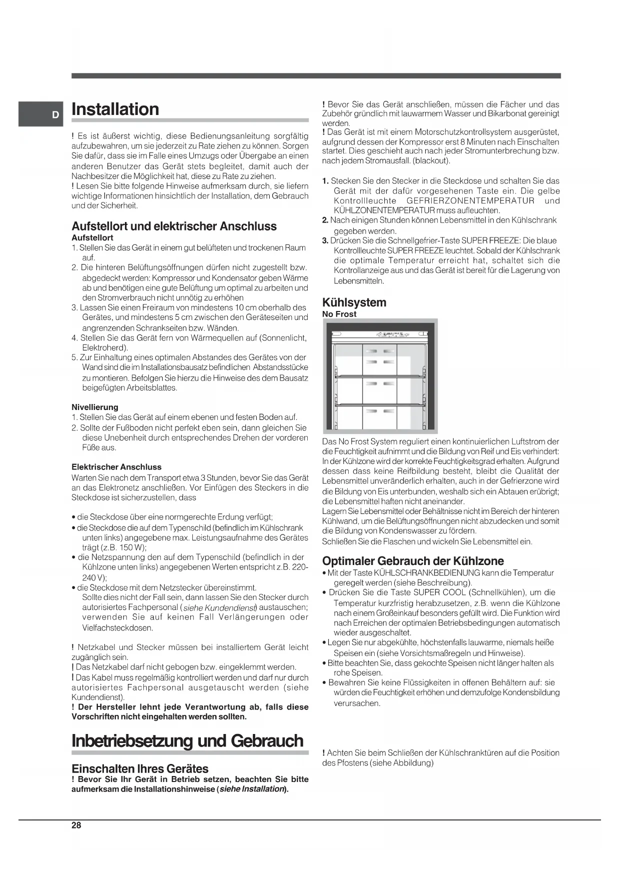 Inhaltsverzeichnis Gebrauchsanleitungen, 1 Kundendienst, 4 Beschreibung Ihres Gerätes, 7 Beschreibung Ihres Gerätes, 12 Installation, 28 Inbetriebsetzung und Gebrauch, 29 Wartung und Pflege, 30 Vorsichtsmaßregeln und Hinweise, 31 Störungen und Abhilfe, 31