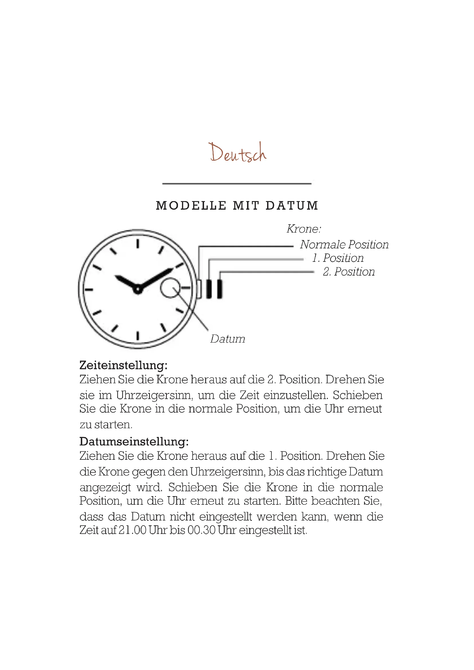 Sie die Krone im Uhrzeigersinn. Drehen Sie weiter, und alle 24 Stunden bewegt sich der Tageszeiger zum nächsten Tag. Machen Sie weiter, bis der richtige Tag angezeigt wird. Stellen Sie die Zeit ein und gehen Sie zurück auf die normale Position. Einstellung des Tages: Ziehen Sie die Krone heraus auf die 1. Position. Drehen Sie die Krone gegen den Uhrzeigersinn, bis der richtige Tag angezeigt wird. Schieben Sie die Krone in die normale Position, um die Uhr erneut zu starten. Bitte beachten Sie, dass das Datum nicht eingestellt werden kann, wenn die Zeit auf 21.00 Uhr bis 00.30 Uhr eingestellt ist. Datumseinstellung:53