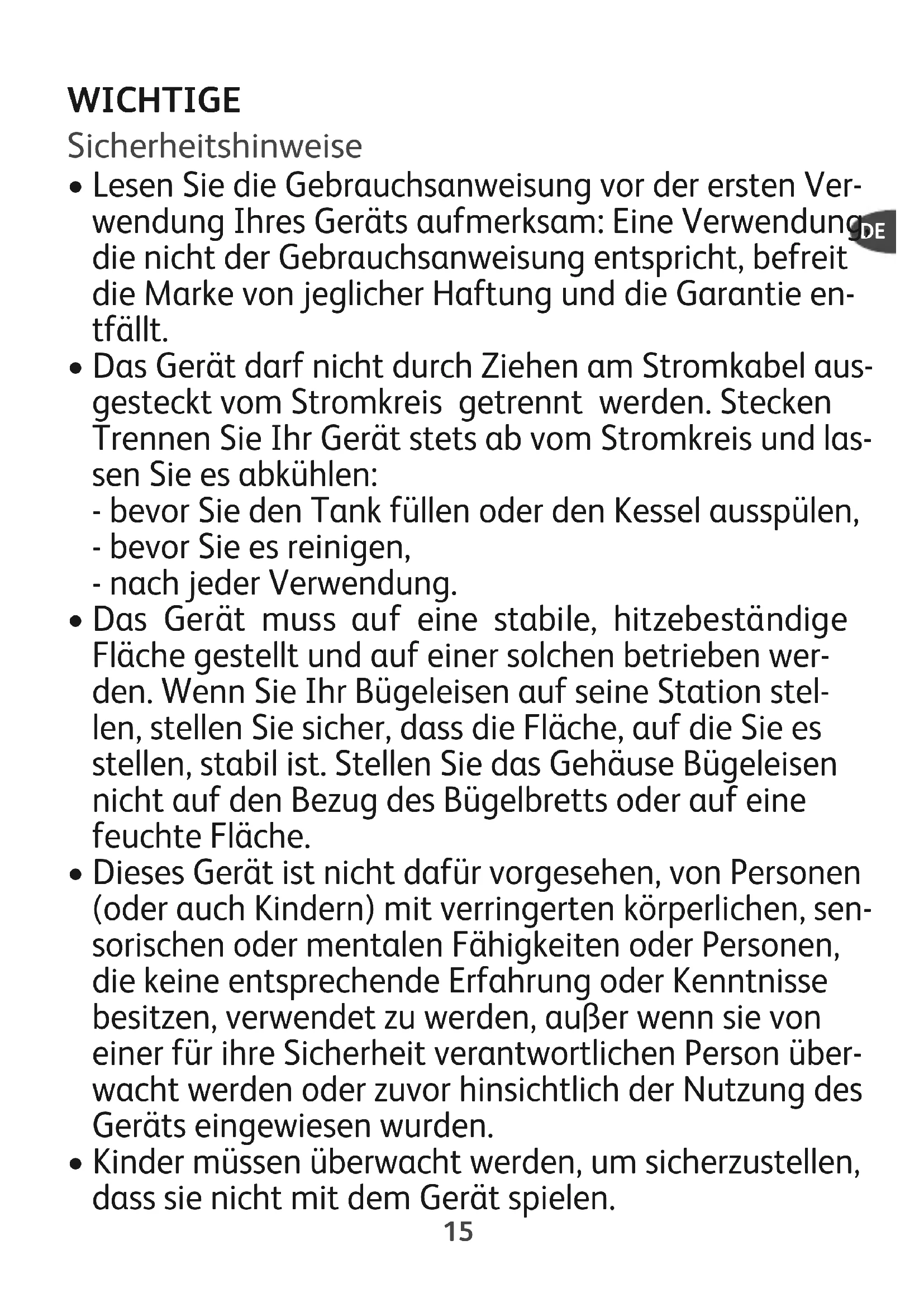- Lesen Sie die Gebrauchsanweisung vor der ersten Ver- wendung Ihres Geräts aufmerksam: Eine Verwendung, die nicht der Gebrauchsanweisung entspricht, befreit die Marke von jeglicher Haftung und die Garantie en- tfällt.