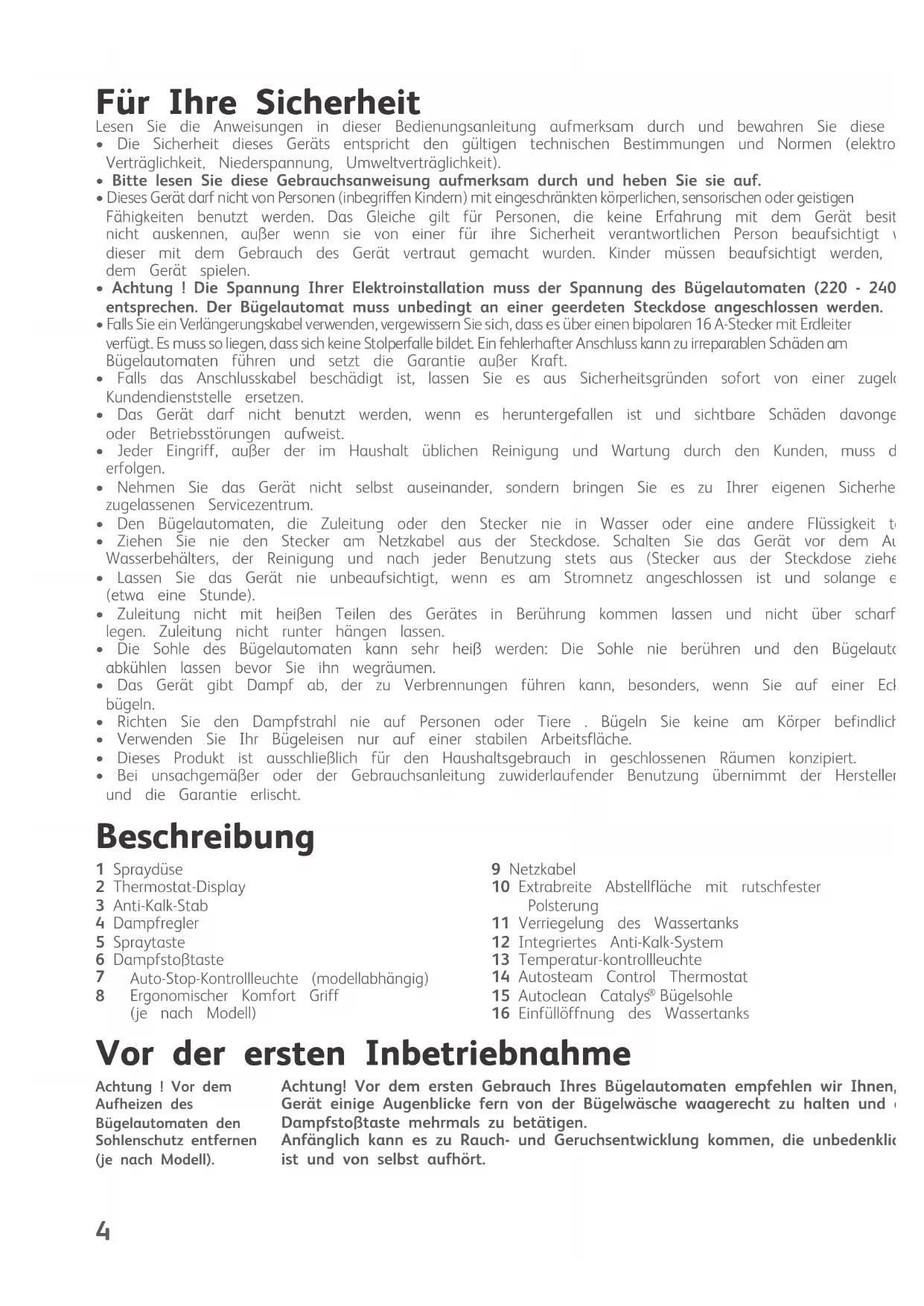 - Bei unsachgemäßer oder der Gebrauchsanleitung zuwiderlaufender Benutzung übernimmt der Hersteller keine Haftung und die Garantie erlischt. Beschreibung Vor der ersten Inbetriebnahme Achtung! Vor dem ersten Gebrauch Ihres Bügelautomaten empfehlen wir Ihnen, das Gerät einige Augenblicke fern von der Bügelwäsche waagerecht zu halten und die Dampfstoßtaste mehrmals zu betätigen. Anfänglich kann es zu Rauch- und Geruchsentwicklung kommen, die unbedenklich ist und von selbst aufhört. Achtung ! Vor dem Aufheizen des Bügelautomaten den Sohlenschutz entfernen (je nach Modell). 1 Spraydüse 2 Thermostat-Display 3 Anti-Kalk-Stab 4 Dampfregler 5 Spraytaste 6 Dampfstoßtaste