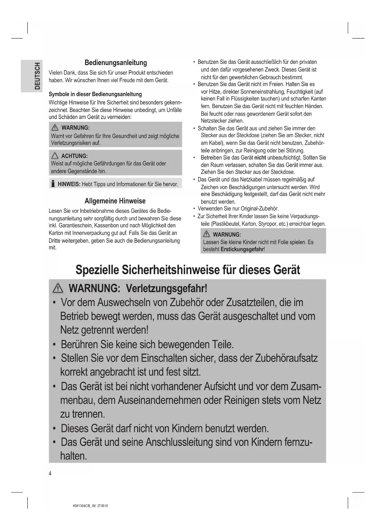 - Das Gerät und seine Anschlussleitung sind von Kindern fernzu- halten.5 KM1394CB_IM 27.09.16 WARNUNG: Verletzungsgefahr!