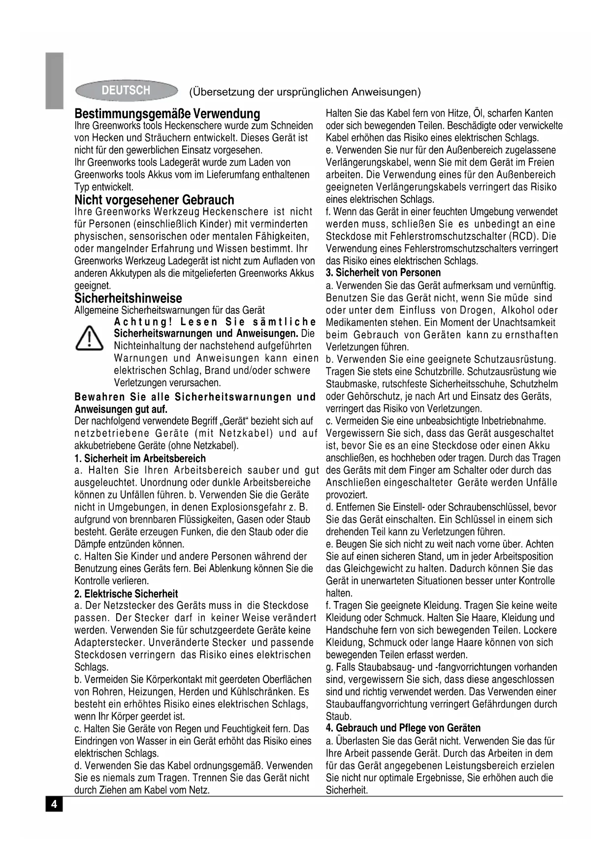 EC declaration of conformity MACHINERY DIRECTIVE 22147T Greenworks tools declares that these products described under “technical data” are in compliance with: 2006/42/EC, EN60745-1, EN60745-2-15,ENZSO10517 2000/14/EC, Hedge trimmer 1500 min-1, Annex V LWA (measured sound power) 96.7 dB(A), LWA (guaranteed sound power) 99 dB(A), These products also comply with directive 2004/108/EC. For more information, please contact Greenworks tools at the following address. The undersigned is responsible for compilation of the technical file and makes this declaration on behalf of Greenworks tools. Signature: Gary Gao Naixin (BEng, CEng, MIET) Vice president of Engineering Globe Tools Europe 1 Etage Schillingsrotterstr. 38 50996 Cologne Germany Greenworks Tools Europe GmbH, Wankelstrasse 40. 50996 Koln Germany4 Bestimmungsgemäße Verwendung Ihre Greenworks tools Heckenschere wurde zum Schneiden von Hecken und Sträuchern entwickelt. Dieses Gerät ist nicht für den gewerblichen Einsatz vorgesehen. Ihr Greenworks tools Ladegerät wurde zum Laden von Greenworks tools Akkus vom im Lieferumfang enthaltenen Typ entwickelt. Nicht vorgesehener Gebrauch Ihre Greenworks Werkzeug Heckenschere ist nicht für Personen (einschließlich Kinder) mit verminderten physischen, sensorischen oder mentalen Fähigkeiten, oder mangelnder Erfahrung und Wissen bestimmt. Ihr Greenworks Werkzeug Ladegerät ist nicht zum Aufladen von anderen Akkutypen als die mitgelieferten Greenworks Akkus geeignet. Sicherheitshinweise Allgemeine Sicherheitswarnungen für das Gerät Achtung! Lesen Sie sämtliche Sicherheitswarnungen und Anweisungen. Die Nichteinhaltung der nachstehend aufgeführten Warnungen und Anweisungen kann einen elektrischen Schlag, Brand und/oder schwere Verletzungen verursachen. Bewahren Sie alle Sicherheitswarnungen und Anweisungen gut auf. Der nachfolgend verwendete Begriff „Gerät“ bezieht sich auf netzbetriebene Geräte (mit Netzkabel) und auf akkubetriebene Geräte (ohne Netzkabel).
