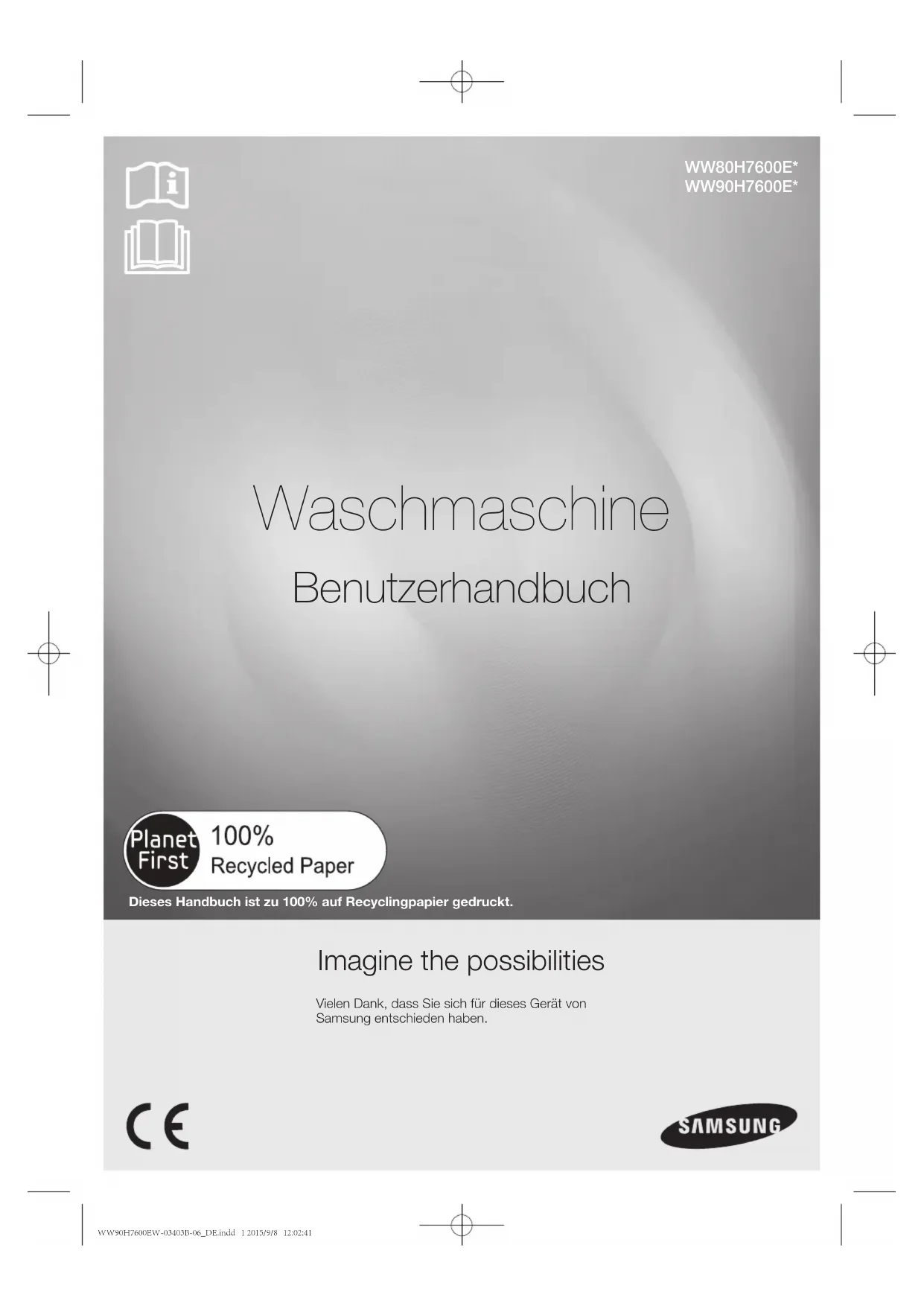 Dieses Handbuch ist zu 100% auf Recyclingpapier gedruckt. Waschmaschine Benutzerhandbuch Imagine the possibilities Vielen Dank, dass Sie sich für dieses Gerät von Samsung entschieden haben. WW80H7600E* WW90H7600E* WW90H7600EW-03403B-06_DE.indd 1 2015/9/8 12:02:41Deutsch - 2 Inhalt Sicherheitsinformationen 3 Das Müssen Sie über die Sicherheitshinweise wissen 3 Wichtige Sicherheitssymbole 3 Wichtige Sicherheitsvorkehrungen 4 DAS WEEE-ZEICHEN 10 Installation 11 Das ist inbegriffen 11 Installationsanforderungen 12 Schrittweise Installation 14 Vor dem Start 18 Grundeinstellungen 18 Waschhinweise 19 Richtlinien Waschmittelbehälter 21 Betrieb 23 Bedienfeld 23 Einfache Schritte für den Start 24 Programmübersicht 25 Einstellungen 28 Wartung 29 Trommelreinigung 29 Intelligente Pflege 30 Notablauf 31 Reinigung 32 Wiederherstellung nach Einfrieren 35 Sorgen Sie dafür, dass sie nicht über längere Zeit nicht genutzt wird 35 Fehlersuche 36 Prüfpunkte 36 Fehlercodes 37 Technische Daten 38 Entsorgung von Altgeräten 38 Erklärung der Pflegesymbole 39 Datenblatt für Haushaltswaschmaschinen 40 Informationen zu den Hauptwaschprogrammen 42 WW90H7600EW-03403B-06_DE.indd 2 2015/9/8 12:02:42Deutsch - 3 01 SICHERHEITSINFORMATIONEN Sicherheitsinformationen Wir beglückwünschen Sie zum Kauf Ihrer neuen Samsung Waschmaschine. Diese Anleitung enthält wichtige Informationen über die Installation, den Gebrauch und die Pflege Ihrer Waschmaschine. Bitte lesen Sie diese Bedienungsanleitung in Ruhe durch – nur so können Sie von den vielfältigen Funktionen und Vorteilen Ihrer Waschmaschine profitieren. Das Müssen Sie über die Sicherheitshinweise wissen Lesen Sie bitte diese Bedienungsanleitung sorgfältig durch, damit Sie verstehen, wie die umfangreichen Features und Funktionen Ihres neuen Gerätes sicher und effizient genutzt werden. Bitte bewahren Sie das Handbuch als künftige Referenz an einem sicheren Ort in der Nähe des Geräts auf. Verwenden Sie die Waschmaschine nur für den in der vorliegenden Bedienungsanleitung angegebenen Zweck. Die in dieser Bedienungsanleitung enthaltenen Warnhinweise und die wichtigen Sicherheitshinweise decken nicht alle Bedingungen und Situationen, die auftreten können, ab. Es liegt in Ihrer Verantwortung, bei Installation, Pflege und Gebrauch Ihrer Waschmaschine Ihren gesunden Menschenverstand sowie Vorsicht und Sorgfalt walten zu lassen. Die vorliegende Bedienungsanleitung gilt für mehrere Modelle; Ihre Waschmaschine kann deshalb leicht von der in dieser Bedienungsanleitung beschriebenen Maschine abweichen und manche Warnzeichen gelten unter Umständen für Sie nicht. Bei Fragen oder Unklarheiten wenden Sie sich bitte an Ihr nächstes Servicezentrum oder informieren Sie sich unter www.samsung.com. Wichtige Sicherheitssymbole Bedeutung der Symbole und Zeichen in diesem Benutzerhandbuch: WARNUNG: Gefahren oder unsichere Handlungsweisen, die zu schweren oder tödlichen Verletzungen und/oder Sachbeschädigung führen können ACHTUNG: Gefahren oder unsichere Handlungsweisen, die zu Verletzungen und/oder Sachbeschädigung führen können BEMERKUNG Diese Warnzeichen sollen Sie und andere vor Verletzungen schützen Bitte halten Sie sie genau ein Bewahren Sie dieses Handbuch als künftige Referenz an einem sicheren Ort auf, nachdem Sie es gelesen haben Lesen Sie alle Anweisungen aufmerksam durch, ehe Sie Ihre Waschmaschine benutzen. Wie bei jedem Gerät, das mit elektrischem Strom betrieben wird, gibt es gewisse Gefahren. Für den sicheren Betrieb dieses Geräts machen Sie sich mit der Bedienung vertraut und benutzen es mit entsprechender Vorsicht. WW90H7600EW-03403B-06_DE.indd 3 2015/9/8 12:02:42Deutsch - 4 Wichtige Sicherheitsvorkehrungen WARNUNG: Um das Risiko von Feuer, Stromschlag oder Personenschäden bei Verwendung Ihres Geräts zu reduzieren, befolgen Sie grundlegende Vorsichtsmaßnahmen, einschließlich der folgenden:
