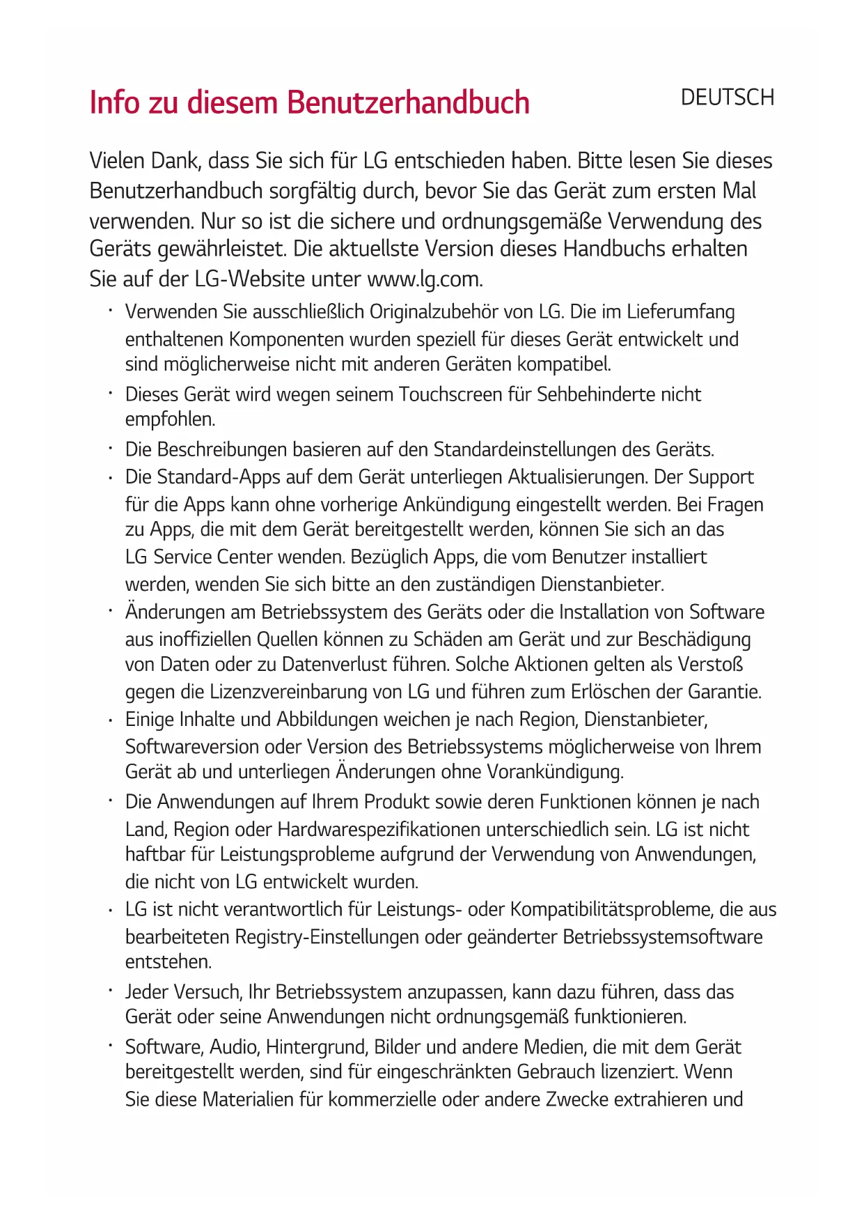Änderungen am Betriebssystem des Geräts oder die Installation von Software aus inoffiziellen Quellen können zu Schäden am Gerät und zur Beschädigung von Daten oder zu Datenverlust führen. Solche Aktionen gelten als Verstoß gegen die Lizenzvereinbarung von LG und führen zum Erlöschen der Garantie.