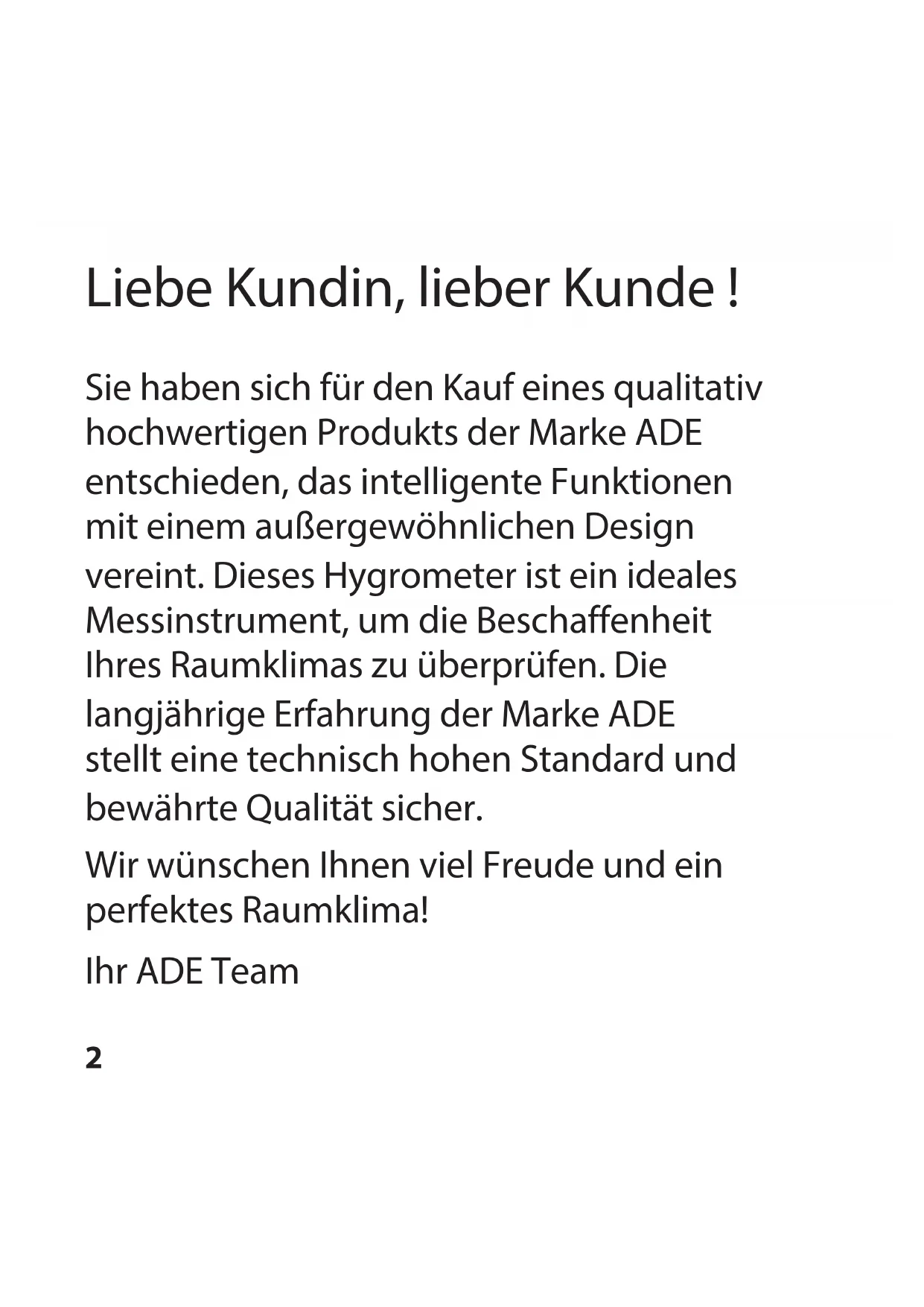 PL2 Liebe Kundin, lieber Kunde ! Sie haben sich für den Kauf eines qualitativ hochwertigen Produkts der Marke ADE entschieden, das intelligente Funktionen mit einem außergewöhnlichen Design vereint. Dieses Hygrometer ist ein ideales Messinstrument, um die Beschaffenheit Ihres Raumklimas zu überprüfen. Die langjährige Erfahrung der Marke ADE stellt eine technisch hohen Standard und bewährte Qualität sicher. Wir wünschen Ihnen viel Freude und ein perfektes Raumklima! Ihr ADE Team3