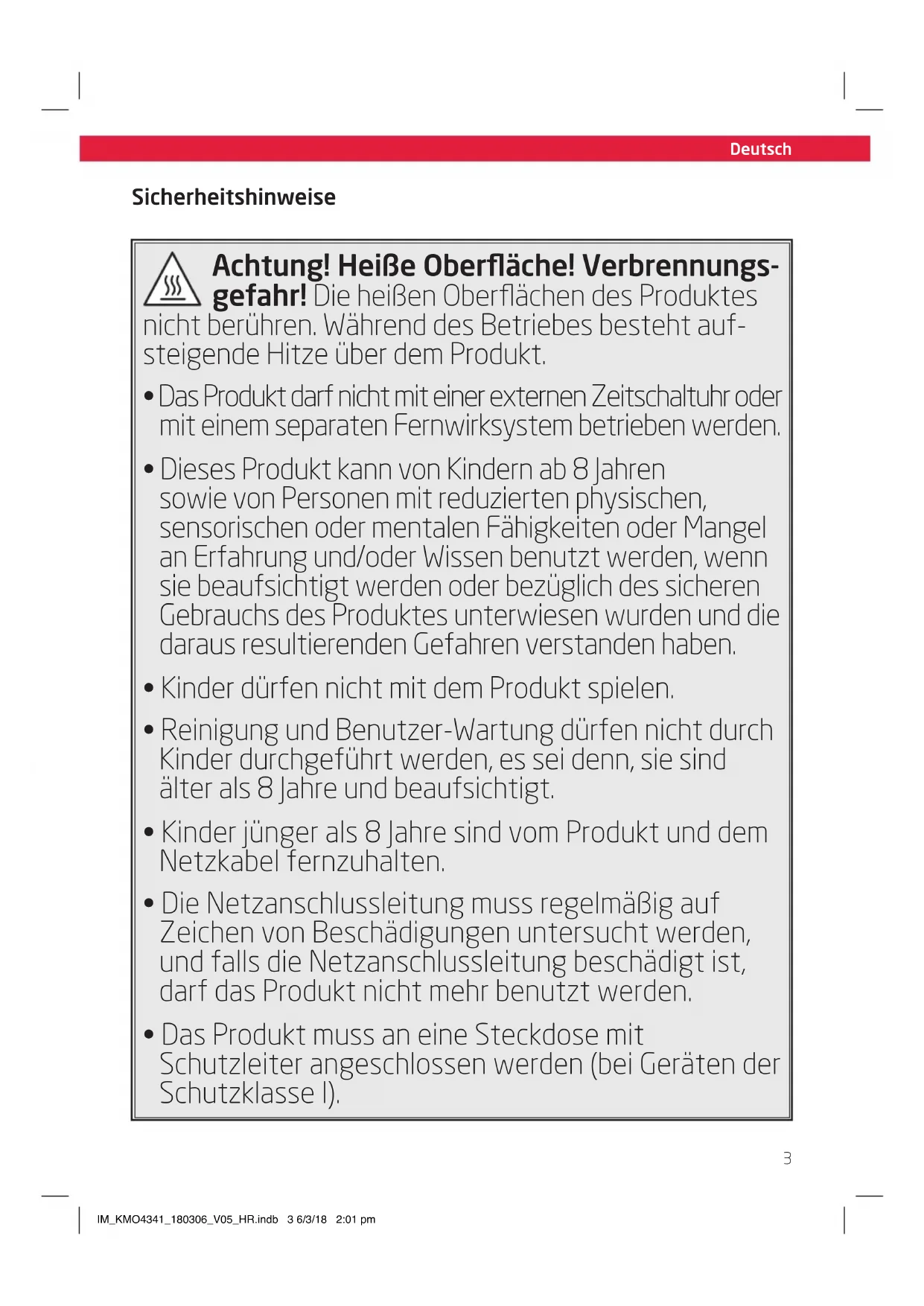 - Das Produkt muss an eine Steckdose mit Schutzleiter angeschlossen werden (bei Geräten der Schutzklasse I). IM_KMO4341_180306_V05_HR.indb 3 6/3/18 2:01 pmDeutsch
