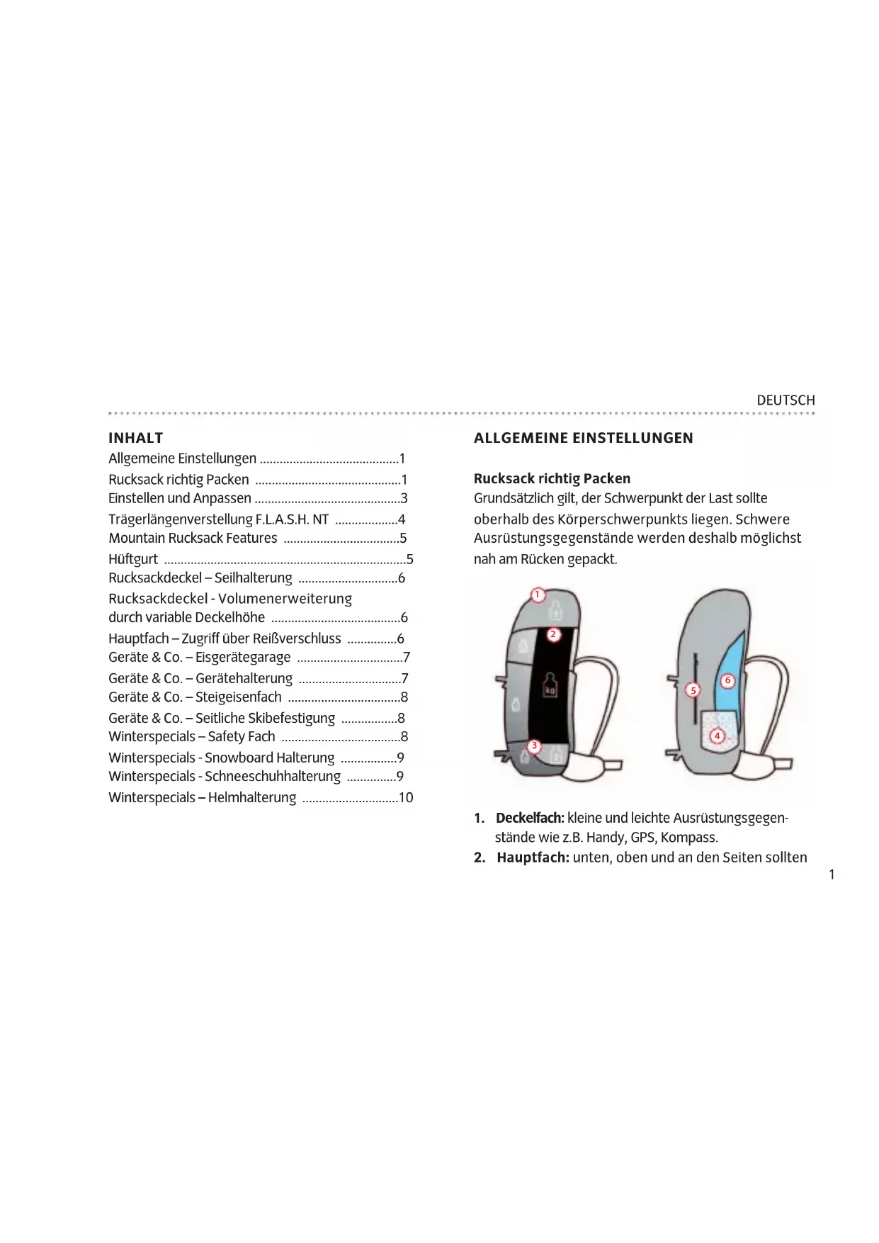 DEUTSCH leichtere Dinge gepackt werden, z.B. Bekleidung. In der Mitte und nahe am Rücken sind die schweren Gepäckstücke zu verstauen, wie z.B. Kletteraus- rüstung (Karabiner, Keile, Expressen), Zelt, Konserven oder Wasservorrat.
