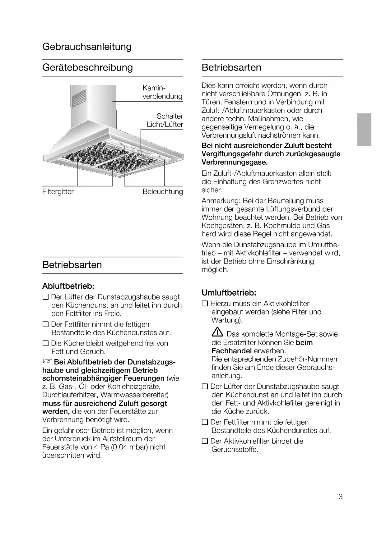Bei Abluftbetrieb der Dunstabzugs- haube und gleichzeitigem Betrieb schornsteinabhängiger Feuerungen (wie z. B. Gas-, Öl- oder Kohleheizgeräte, Durchlauferhitzer, Warmwasserbereiter) muss für ausreichend Zuluft gesorgt werden, die von der Feuerstätte zur Ver- brennung benötigt wird. Ein gefahrloser Betrieb ist möglich, wenn der Unterdruck im Aufstellraum der Feuerstätte von 4 Pa (0,04 mbar) nicht überschritten wird. Dies kann erreicht werden, wenn durch nicht verschließbare Öffnungen, z. B. in Türen, Fenstern und in Verbindung mit Zuluft-/Abluftmauerkasten oder durch andere techn. Maßnahmen, wie gegenseiti- ge Verriegelung o. ä., die Verbrennungsluft nachströmen kann. Bei nicht ausreichender Zuluft besteht Vergiftungsgefahr durch zurückgesaugte Verbrennungsgase. Ein Zuluft-/Abluftmauerkasten allein stellt die Einhaltung des Grenzwertes nicht sicher. Anmerkung: Bei der Beurteilung muss immer der gesamte Lüftungsverbund der Wohnung beachtet werden. Bei Betrieb von Kochgeräten, z. B. Kochmulde und Gasherd wird diese Regel nicht angewendet. Wenn die Dunstabzugshaube im Umluftbe- trieb – mit Aktivkohlefilter – verwendet wird, ist der Betrieb ohne Einschränkung möglich.