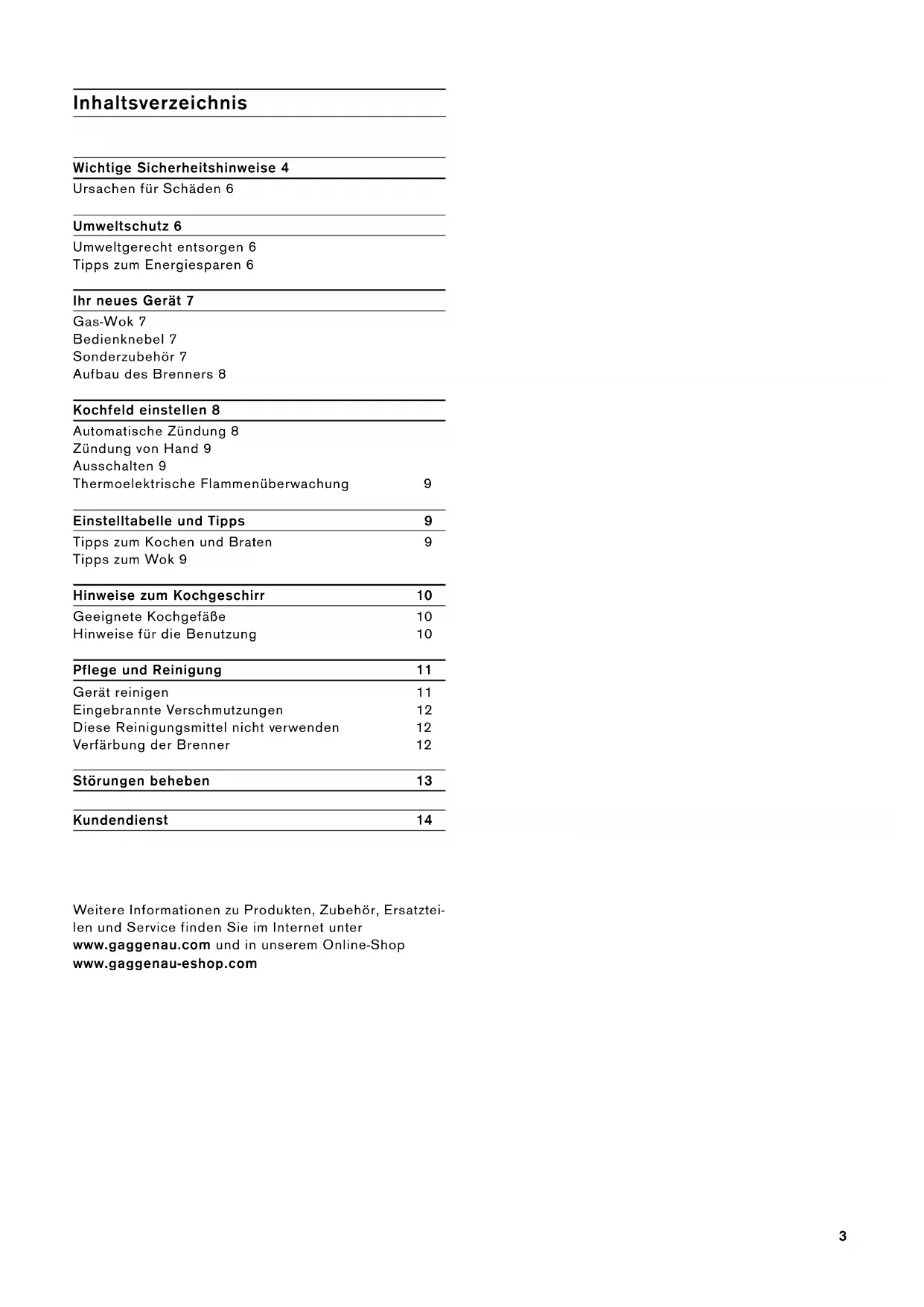 Gaggenau Gaggenau Gebrauchsanleitung Gebruiksaanwijzing Notice d'utilisation Istruzioni per l’uso VG 231 Gas-Wok Wokbrander Wok gaz Piano cottura a gas Wok2 Inhaltsverzeichnis 3 Inhoudsopgave 15 Table des matières 27 Indice 393 Inhaltsverzeichnis Gebrauchsanleitung Wichtige Sicherheitshinweise 4 Ursachen für Schäden 6 Umweltschutz 6 Umweltgerecht entsorgen 6 Tipps zum Energiesparen 6 Ihr neues Gerät 7 Gas-Wok 7 Bedienknebel 7 Sonderzubehör 7 Aufbau des Brenners 8 Kochfeld einstellen 8 Automatische Zündung 8 Zündung von Hand 9 Ausschalten 9 Thermoelektrische Flammenüberwachung 9 Einstelltabelle und Tipps 9 Tipps zum Kochen und Braten 9 Tipps zum Wok 9 Hinweise zum Kochgeschirr 10 Geeignete Kochgefäße 10 Hinweise für die Benutzung 10 Pflege und Reinigung 11 Gerät reinigen 11 Eingebrannte Verschmutzungen 12 Diese Reinigungsmittel nicht verwenden 12 Verfärbung der Brenner 12 Störungen beheben 13 Kundendienst 14 : Weitere Informationen zu Produkten, Zubehör, Ersatztei- len und Service finden Sie im Internet unter www.gaggenau.com und in unserem Online-Shop www.gaggenau-eshop.com4 m Wichtige Sicherheitshinweise Diese Anleitung sorgfältig lesen. Nur dann kön- nen Sie Ihr Gerät sicher und richtig bedienen. Die Gebrauchs- und Montageanleitung für einen späteren Gebrauch oder für Nachbesitzer auf- bewahren. Der Einbau des Gerätes muss gemäß der beige- fügten Montageanleitung erfolgen. Das Gerät nach dem Auspacken prüfen. Bei einem Transportschaden nicht anschließen. Nur ein konzessionierter Fachmann darf das Gerät anschließen. Bei Schäden durch falschen Anschluss besteht kein Anspruch auf Garantie. Für die Umstellung auf eine andere Gasart den Kundendienst rufen. Dieses Gerät ist nur für den privaten Haushalt und das häusliche Umfeld bestimmt. Das Gerät nur zum Zubereiten von Speisen und Getränken benutzen, niemals als Heizgerät verwenden. Das Gerät während des Betriebes beaufsichti- gen. Das Gerät nur in einem Innenraum verwen- den. Dieses Gerät ist für eine Nutzung bis zu einer Höhe von maximal 2000 Metern über dem Mee- resspiegel bestimmt. Dieses Gerät ist nicht für den Betrieb mit einer externen Zeitschaltuhr oder einer Fernsteue- rung bestimmt. Benutzen Sie keine ungeeigneten Schutzvor- richtungen oder Kinderschutzgitter. Sie können zu Unfällen führen. Dieses Gerät kann von Kindern ab 8 Jahren und Personen mit reduzierten physischen, sensori- schen oder mentalen Fähigkeiten oder Mangel an Erfahrung oder Wissen benutzt werden, wenn sie von einer Person, die für ihre Sicher- heit verantwortlich ist, beaufsichtigt oder von ihr bezüglich des sicheren Gebrauchs des Gerätes unterwiesen wurden und sie die daraus resultie- renden Gefahren verstanden haben. Kinder dürfen nicht mit dem Gerät spielen. Rei- nigung und Benutzer-Wartung dürfen nicht durch Kinder durchgeführt werden, es sei denn, sie sind 8 Jahre und älter und werden beaufsich- tigt. Kinder jünger als 8 Jahre vom Gerät und der Anschlussleitung fernhalten. VERHALTEN BEI GASGERUCH! Ausströmendes Gas kann zu einer Explosion führen. Werden Gasgeruch oder Störungen an der Gasinstallation bemerkt: ▯ Sofort die Gaszufuhr oder das Ventil der Gasflasche schließen. ▯ Sofort offenes Feuer und Zigaretten ausma- chen. ▯ Licht- und Geräteschalter nicht mehr betäti- gen, keine Stecker aus der Steckdose zie- hen. Kein Telefon oder Handy im Haus benutzen. ▯ Fenster öffnen und den Raum gut lüften. ▯ Kundendienst oder Gasversorgungs-Gesell- schaft anrufen. Erstickungsgefahr! Die Benutzung eines Gaskochgerätes führt zur Bildung von Wärme, Feuchtigkeit und Verbren- nungsprodukten im Aufstellungsraum. Auf gute Belüftung des Aufstellraumes achten. Die natür- lichen Belüftungsöffnungen sind offen zu halten oder es ist eine mechanische Lüftungseinrich- tung (z.B. eine Dunstabzugshaube) vorzusehen. Eine intensive und lang andauernde Benutzung des Gerätes kann eine zusätzliche Belüftung, z.B. Öffnen eines Fensters, oder eine wirksa- mere Belüftung, z.B. Betrieb der vorhandenen mechanischen Lüftungseinrichtung auf höherer Leistungsstufe, erforderlich machen.5 Brandgefahr! ▯ Heißes Öl und Fett entzündet sich schnell. Heißes Öl und Fett nie unbeaufsichtigt las- sen. Nie ein Feuer mit Wasser löschen. Kochstelle ausschalten. Flammen vorsichtig mit Deckel, Löschdecke oder Ähnlichem ersticken. Brandgefahr! ▯ Das Gerät wird sehr heiß, brennbare Materi- alien können sich entzünden. Nie brennbare Gegenstände (z. B. Spraydosen, Reini- gungsmittel) unter dem Gerät oder in unmit- telbarer Nähe lagern oder benutzen. Nie brennbare Gegenstände auf oder in das Gerät legen. Brandgefahr! ▯ Gas-Kochstellen ohne aufgesetztes Kochge- schirr entwickeln im Betrieb große Hitze. Das Gerät und eine darüber angebrachte Dunstabzugshaube können beschädigt oder in Brand gesetzt werden. Fettrückstände im Filter der Dunstabzugshaube können sich entzünden. Gas-Kochstellen nur mit aufge- setztem Kochgeschirr betreiben. Verbrennungsgefahr! ▯ Die zugänglichen Teile werden im Betrieb heiß. Nie die heißen Teile berühren. Kinder fernhalten. Verbrennungsgefahr! ▯ Bei geschlossener Geräteabdeckung kommt es zum Wärmestau. Die Geräteabde- ckung erst schließen, wenn das Gerät abge- kühlt ist. Das Gerät nie mit geschlossener Geräteabdeckung einschalten. Die Geräte- abdeckung nicht zum Warmhalten oder Abstellen benutzen. Verbrennungsgefahr! ▯ Leeres Kochgeschirr wird auf betriebenen Gas-Kochstellen extrem heiß. Nie leeres Kochgeschirr erhitzen. Verletzungsgefahr! ▯ Unsachgemäße Reparaturen sind gefähr- lich. Nur ein von uns geschulter Kunden- dienst-Techniker darf Reparaturen durchführen und beschädigte Strom- und Gasleitungen austauschen. Ist das Gerät defekt, Netzstecker ziehen oder Sicherung im Sicherungskasten ausschalten, Gaszu- fuhr schließen. Kundendienst rufen. Verletzungsgefahr! ▯ Störungen oder Beschädigungen am Gerät sind gefährlich. Nie ein
