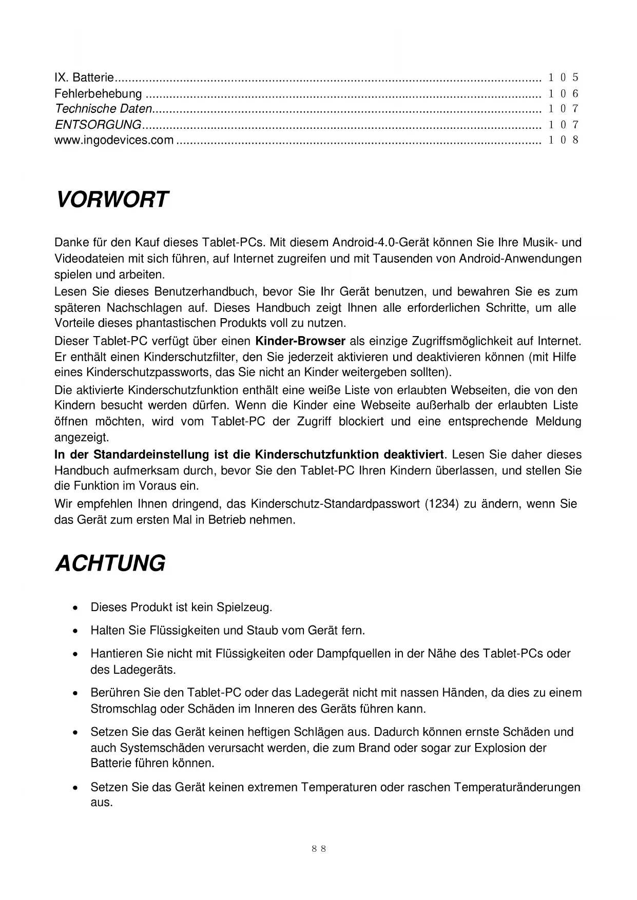 IX. Batterie ............................................................................................................................. 105 Fehlerbehebung .................................................................................................................... 106 Technische Daten .................................................................................................................. 107 ENTSORGUNG ..................................................................................................................... 107 www.ingodevices.com ........................................................................................................... 108 VORWORT Danke für den Kauf dieses Tablet-PCs. Mit diesem Android-4.0-Gerät können Sie Ihre Musik- und Videodateien mit sich führen, auf Internet zugreifen und mit Tausenden von Android-Anwendungen spielen und arbeiten. Lesen Sie dieses Benutzerhandbuch, bevor Sie Ihr Gerät benutzen, und bewahren Sie es zum späteren Nachschlagen auf. Dieses Handbuch zeigt Ihnen alle erforderlichen Schritte, um alle Vorteile dieses phantastischen Produkts voll zu nutzen. Dieser Tablet-PC verfügt über einen Kinder-Browser als einzige Zugriffsmöglichkeit auf Internet. Er enthält einen Kinderschutzfilter, den Sie jederzeit aktivieren und deaktivieren können (mit Hilfe eines Kinderschutzpassworts, das Sie nicht an Kinder weitergeben sollten). Die aktivierte Kinderschutzfunktion enthält eine weiße Liste von erlaubten Webseiten, die von den Kindern besucht werden dürfen. Wenn die Kinder eine Webseite außerhalb der erlaubten Liste öffnen möchten, wird vom Tablet-PC der Zugriff blockiert und eine entsprechende Meldung angezeigt. In der Standardeinstellung ist die Kinderschutzfunktion deaktiviert. Lesen Sie daher dieses Handbuch aufmerksam durch, bevor Sie den Tablet-PC Ihren Kindern überlassen, und stellen Sie die Funktion im Voraus ein. Wir empfehlen Ihnen dringend, das Kinderschutz-Standardpasswort (1234) zu ändern, wenn Sie das Gerät zum ersten Mal in Betrieb nehmen. ACHTUNG
