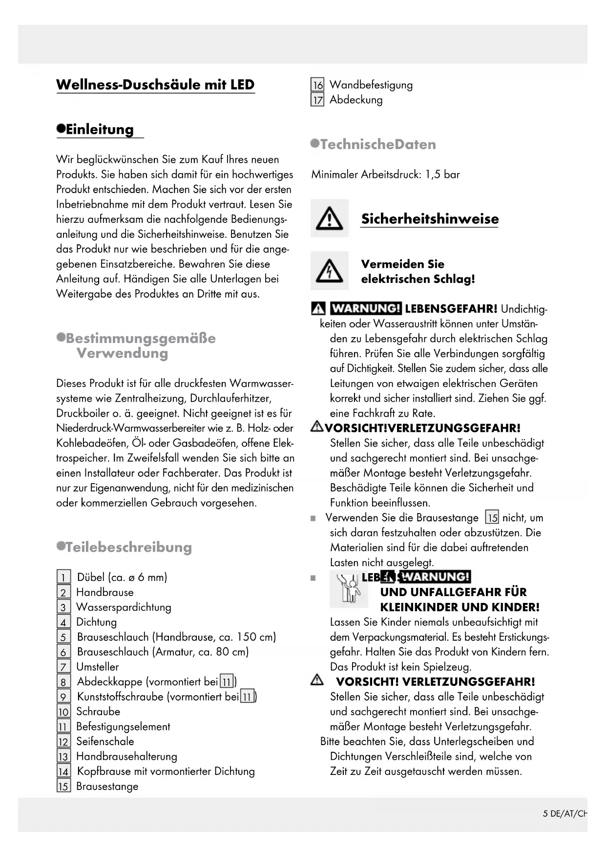 reduziert den Wasserfluss. Dies kann Auswirkungen auf die Funktion Ihres Durchlauferhitzers haben. Wenn der Wasserdurchfluss zu gering ist, schaltet sich Ihr Durchlauferhitzer automatisch ab. Umsteller: Drücken Sie die entsprechende Taste, um die entsprechende Funktion auszuwählen (Kopf- oder Handbrause). Reinigung und Pflege Reinigen Sie Ihre LED-Duschsäule nur mit klarem Wasser, milden Reinigungsmitteln und einem weichen Tuch bzw. Leder. Verwenden Sie Kalkablagerungen an der LED- Duschsäule mit Hilfe eines Kalkreinigers. Halten7 DE/AT/CH Sie sich bei der Reinigung an die Anweisungen des Reinigungsmittelherstellers. Entsorgung Die Verpackung besteht aus umweltfreundlichen Materialien, die Sie über die örtlichen Recycling- stellen entsorgen können. Möglichkeiten zur Entsorgung des ausgedienten Produkts erfahren Sie bei Ihrer Gemeinde oder Stadtverwaltung. Informationen Trinkbarkeit von Leitungswasser Informieren Sie sich bei Ihren örtlichen Behörden über die Trinkbarkeit des Wassers in Ihrer Stadt / Gemeinde. Generell gilt für die Trinkbarkeit von Leitungswasser folgende Empfehlung: Lassen Sie Wasser aus Leitungen eine kurze Zeit laufen, wenn es länger als vier Stunden in den Leitungen stagniert hat. Verwenden Sie kein Stagnationswasser zur Zubereitung von Speisen und Getränken, besonders nicht bei der Ernährung von Säuglingen. Andernfalls können gesundheitliche Beschwerden auftreten. Frisches Wasser können Sie daran erkennen, dass es spürbar kühler die Leitung verlässt, als Stagnationswasser. Verwenden Sie kein Stagnationswasser aus verchromten Leitungen zur Ernährung und / oder zur Körperpflege, wenn Sie gegen Nickel allergisch sind. Solches Wasser kann stark nickelhaltig sein und eine allergische Reaktion hervorrufen. Nutzen Sie kein Trinkwasser aus Bleileitungen für die Zubereitung von Säuglingsnahrung und / oder während der Schwangerschaft für die Zubereitung von Lebensmitteln. Blei wird ins Trinkwasser abgegeben und ist für Säuglinge und Kleinkinder besonders gesundheitsschädlich. Garantie Das Produkt wurde nach strengen Qualitätsrichtlinien sorgfältig produziert und vor Anlieferung gewissen- haft geprüft. Im Falle von Mängeln dieses Produkts stehen Ihnen gegen den Verkäufer des Produkts ge- setzliche Rechte zu. Diese gesetzlichen Rechte werden durch unsere im Folgenden dargestellte Garantie nicht eingeschränkt. Sie erhalten auf dieses Produkt 3 Jahre Garantie ab Kaufdatum. Die Garantiefrist beginnt mit dem Kauf- datum. Bitte bewahren Sie den Original-Kassenbon gut auf. Diese Unterlage wird als Nachweis für den Kauf benötigt. Tritt innerhalb von 3 Jahren ab dem Kaufdatum die- ses Produkts ein Material- oder Fabrikationsfehler auf, wird das Produkt von uns – nach unserer Wahl – für Sie kostenlos repariert oder ersetzt. Diese Ga- rantie verfällt, wenn das Produkt beschädigt, nicht sachgemäß benutzt oder gewartet wurde. Die Garantieleistung gilt für Material- oder Fabrika- tionsfehler. Diese Garantie erstreckt sich nicht auf Produktteile, die normaler Abnutzung ausgesetzt sind (z. B. Batterien) und daher als Verschleißteile ange- sehen werden können oder für Beschädigungen an zerbrechlichen Teilen, z. B. Schalter, Akkus oder die aus Glas gefertigt sind.8 GB/IE LED Mixer Shower Introduction We congratulate you on the purchase of your new product. You have chosen a high quality product. Familiarise yourself with the product before using it for the first time. In addition, please carefully refer to the operating instructions and the safety advice below. Only use the product as instructed and only for the indicated field of application. Keep these instructions in a safe place. If you pass the product on to anyone else, please ensure that you also pass on all the documentation with it. Proper use This product is suitable for all pressure-tight hot water systems such as central heating boilers, instantaneous water heaters, pressurised boilers and the like. It is not suitable for low-pressure water heaters such as wood or coal burning bath geysers, oil or gas bath geysers, open electrically heated water tanks. If in doubt please seek the advice of a plumber or heating engineer. The product is intended for personal use only and not for medical or commercial use. Description of parts