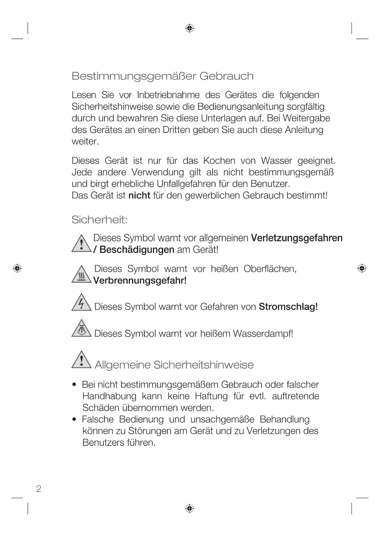 - bei Eigenverschulden des Kunden Die gesetzilchen Gewährleistungen des kunden bleiben durch die Garantie unberührt. Für Geltendmachung eines Garantiefalles innerhalb der Garantiezeit ist durch den Kunden der Nachweis des Kaufes zu führen. Die Garantie ist innerhalb eines Zeitraumes von 2 Jahren ab Kaufdatum gegenüber der KORONA electric GmbH, Sundern. Service Adresse: KORONA Service, Am Steinbach 9, 59872 Meschede- Enste Telefon Hotline: 02933 90284-80 Mail: service@korona-electric.de web: www.korona-electric.de geltend zu machen. Der Kunde hat im Garantiefall das Recht zur Reparatur der Ware bei unseren eigenen oder bei von uns autorisierten Werkstätten. Weitergehende Rechte werden dem Kunden (aufgrund der Garantie) nicht eingeräumt.14 Intended Use Before use, please read these instructions carefully and keep them in a safe place for future reference. When passing on the appliance to a third party, make sure to include these instructions for use. This appliance is only intended for boiling water. Never attempt to heat any other liquids in it. This appliance is only intended for private household use! Safety: This symbol identies hazards which may cause injuries! This symbol warns of hot surfaces. Risk of burns! This symbol identies electric shock hazards! This symbol warns of evaporating steam! General Safety Instructions