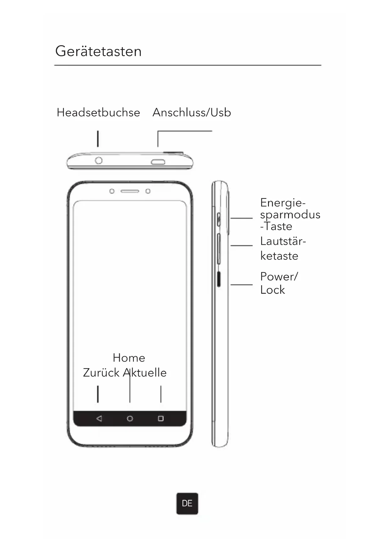 Headsetbuchse Energie- sparmodus -Taste Lautstär- ketaste Power/ Lock Anschluss/Usb Home Zurück AktuelleDE Key Funktion Energiespar- modus-Taste