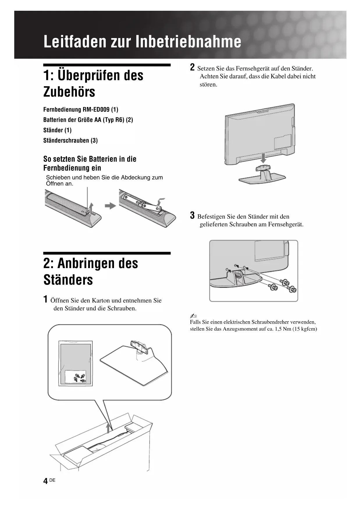 Leitfaden zur Inbetriebnahme 1: Überprüfen des Zubehörs Fernbedienung RM-ED009 (1)Batterien der Größe AA (Typ R6) (2)Ständer (1)Ständerschrauben (3) So setzten Sie Batterien in die Fernbedienung ein 2: Anbringen des Ständers 1 Öffnen Sie den Karton und entnehmen Sie den Ständer und die Schrauben. 2 Setzen Sie das Fernsehgerät auf den Ständer. Achten Sie darauf, dass die Kabel dabei nicht stören. 3 Befestigen Sie den Ständer mit den gelieferten Schrauben am Fernsehgerät. Falls Sie einen elektrischen Schraubendreher verwenden, stellen Sie das Anzugsmoment auf ca. 1,5 Nm (15 kgfcm)Schieben und heben Sie die Abdeckung zum Öffnen an. 010COV.book Page 4 Friday, July 4, 2008 11:56 AM5
