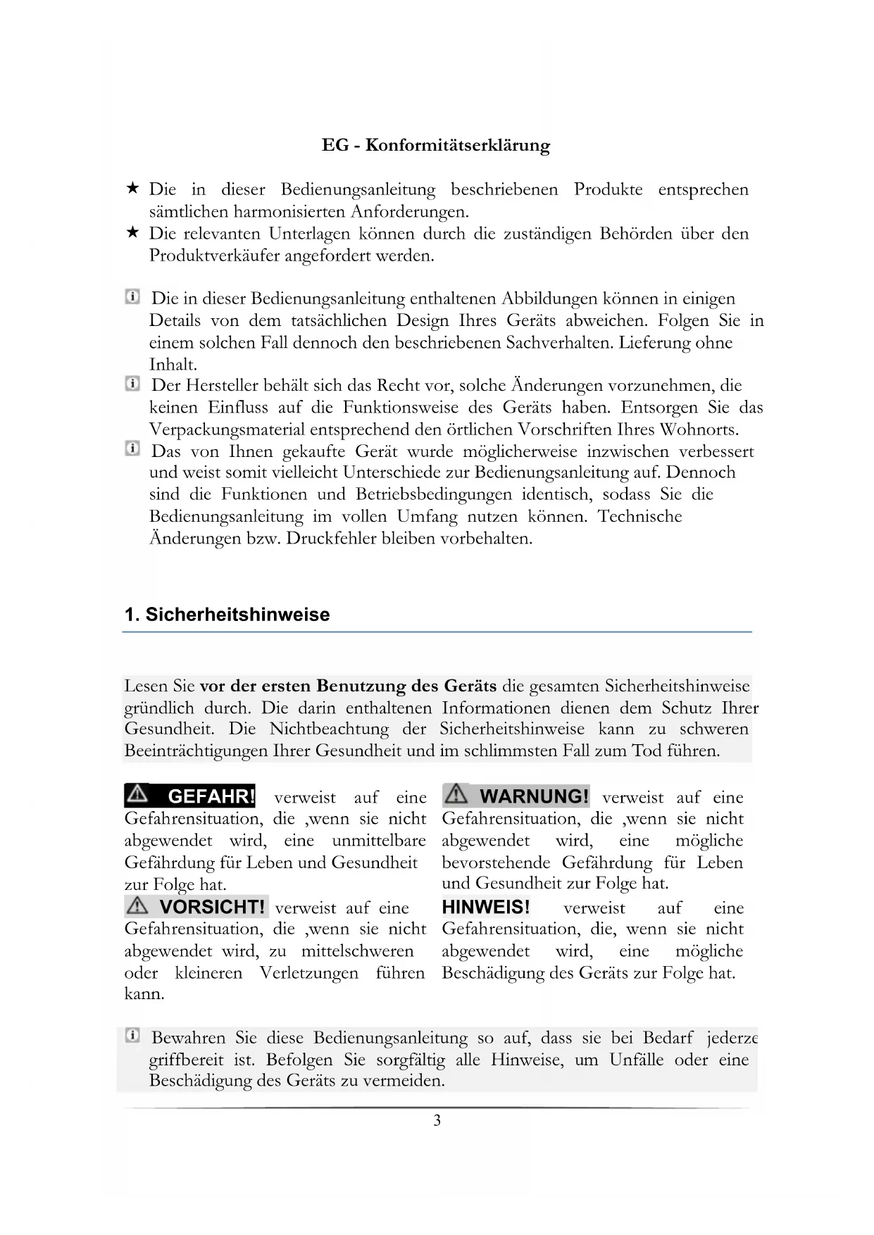 Lesen Sie vor der ersten Benutzung des Geräts die gesamten Sicherheitshinweise gründlich durch. Die darin enthaltenen Informationen dienen dem Schutz Ihrer Gesundheit. Die Nichtbeachtung der Sicherheitshinweise kann zu schweren Beeinträchtigungen Ihrer Gesundheit und im schlimmsten Fall zum Tod führen. GEFAHR! verweist auf eine Gefahrensituation, die ,wenn sie nicht abgewendet wird, eine unmittelbare Gefährdung für Leben und Gesundheit zur Folge hat. WARNUNG! verweist auf eine Gefahrensituation, die ,wenn sie nicht abgewendet wird, eine mögliche bevorstehende Gefährdung für Leben und Gesundheit zur Folge hat. VORSICHT! verweist auf eine Gefahrensituation, die ,wenn sie nicht abgewendet wird, zu mittelschweren oder kleineren Verletzungen führen kann. HINWEIS! verweist auf eine Gefahrensituation, die, wenn sie nicht abgewendet wird, eine mögliche Beschädigung des Geräts zur Folge hat.