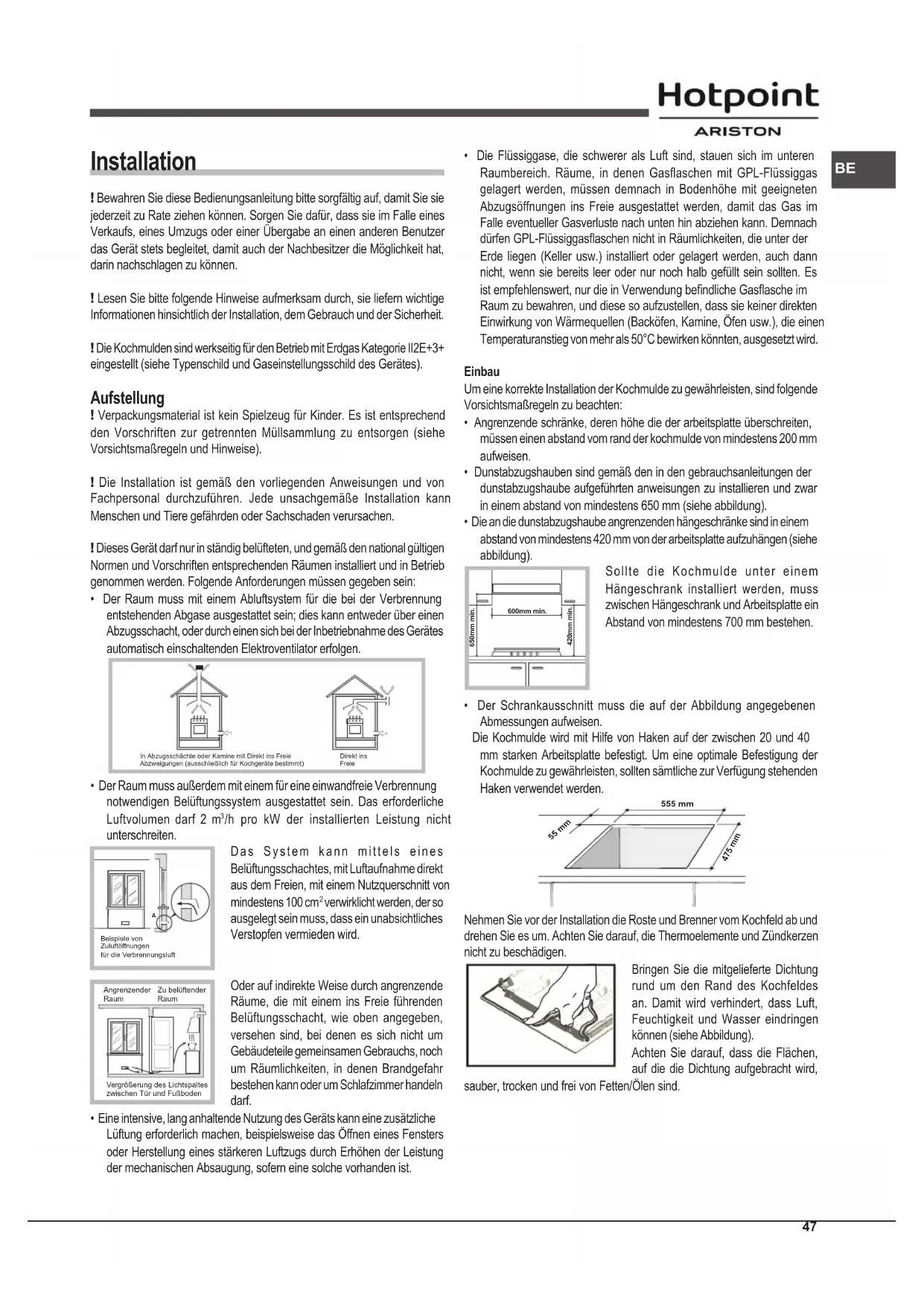 Installation ! Bewahren Sie diese Bedienungsanleitung bitte sorgfältig auf, damit Sie sie jederzeit zu Rate ziehen können. Sorgen Sie dafür, dass sie im Falle eines Verkaufs, eines Umzugs oder einer Übergabe an einen anderen Benutzer das Gerät stets begleitet, damit auch der Nachbesitzer die Möglichkeit hat, darin nachschlagen zu können. ! Lesen Sie bitte folgende Hinweise aufmerksam durch, sie liefern wichtige Informationen hinsichtlich der Installation, dem Gebrauch und der Sicherheit. ! Die Kochmulden sind werkseitig für den Betrieb mit Erdgas Kategorie II2E+3+ eingestellt (siehe Typenschild und Gaseinstellungsschild des Gerätes). Aufstellung ! Verpackungsmaterial ist kein Spielzeug für Kinder. Es ist entsprechend den Vorschriften zur getrennten Müllsammlung zu entsorgen (siehe Vorsichtsmaßregeln und Hinweise). ! Die Installation ist gemäß den vorliegenden Anweisungen und von Fachpersonal durchzuführen. Jede unsachgemäße Installation kann Menschen und Tiere gefährden oder Sachschaden verursachen. ! Dieses Gerät darf nur in ständig belüfteten, und gemäß den national gültigen Normen und Vorschriften entsprechenden Räumen installiert und in Betrieb genommen werden. Folgende Anforderungen müssen gegeben sein: