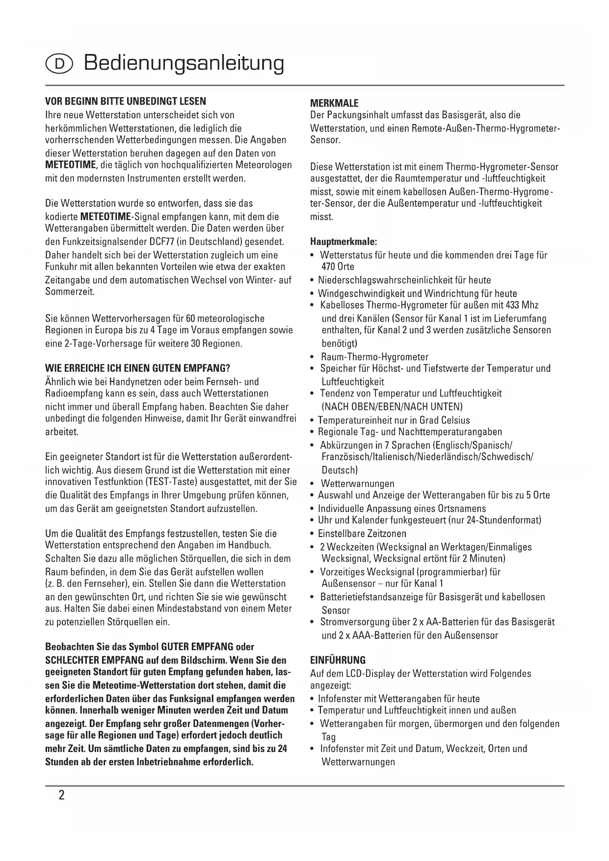 Ihre neue Wetterstation unterscheidet sich von herkömmlichen Wetterstationen, die lediglich die vorherrschenden Wetterbedingungen messen. Die Angaben dieser Wetterstation beruhen dagegen auf den Daten von METEOTIME, die täglich von hochqualifizierten Meteorologen mit den modernsten Instrumenten erstellt werden. Die Wetterstation wurde so entworfen, dass sie das kodierte METEOTIME-Signal empfangen kann, mit dem die Wetterangaben übermittelt werden. Die Daten werden über den Funkzeitsignalsender DCF77 (in Deutschland) gesendet. Daher handelt sich bei der Wetterstation zugleich um eine Funkuhr mit allen bekannten Vorteilen wie etwa der exakten Zeitangabe und dem automatischen Wechsel von Winter- auf Sommerzeit. Sie können Wettervorhersagen für 60 meteorologische Regionen in Europa bis zu 4 Tage im Voraus empfangen sowie eine 2-Tage-Vorhersage für weitere 30 Regionen. WIE ERREICHE ICH EINEN GUTEN EMPFANG? Ähnlich wie bei Handynetzen oder beim Fernseh- und Radioempfang kann es sein, dass auch Wetterstationen nicht immer und überall Empfang haben. Beachten Sie daher unbedingt die folgenden Hinweise, damit Ihr Gerät einwandfrei arbeitet. Ein geeigneter Standort ist für die Wetterstation außerordent- lich wichtig. Aus diesem Grund ist die Wetterstation mit einer innovativen Testfunktion (TEST-Taste) ausgestattet, mit der Sie die Qualität des Empfangs in Ihrer Umgebung prüfen können, um das Gerät am geeignetsten Standort aufzustellen. Um die Qualität des Empfangs festzustellen, testen Sie die Wetterstation entsprechend den Angaben im Handbuch. Schalten Sie dazu alle möglichen Störquellen, die sich in dem Raum befinden, in dem Sie das Gerät aufstellen wollen (z. B. den Fernseher), ein. Stellen Sie dann die Wetterstation an den gewünschten Ort, und richten Sie sie wie gewünscht aus. Halten Sie dabei einen Mindestabstand von einem Meter zu potenziellen Störquellen ein. Beobachten Sie das Symbol GUTER EMPFANG oder SCHLECHTER EMPFANG auf dem Bildschirm. Wenn Sie den geeigneten Standort für guten Empfang gefunden haben, las- sen Sie die Meteotime-Wetterstation dort stehen, damit die erforderlichen Daten über das Funksignal empfangen werden können. Innerhalb weniger Minuten werden Zeit und Datum angezeigt. Der Empfang sehr großer Datenmengen (Vorher- sage für alle Regionen und Tage) erfordert jedoch deutlich mehr Zeit. Um sämtliche Daten zu empfangen, sind bis zu 24 Stunden ab der ersten Inbetriebnahme erforderlich. MERKMALE Der Packungsinhalt umfasst das Basisgerät, also die Wetterstation, und einen Remote-Außen-Thermo-Hygrometer- Sensor. Diese Wetterstation ist mit einem Thermo-Hygrometer-Sensor ausgestattet, der die Raumtemperatur und -luftfeuchtigkeit misst, sowie mit einem kabellosen Außen-Thermo-Hygrome