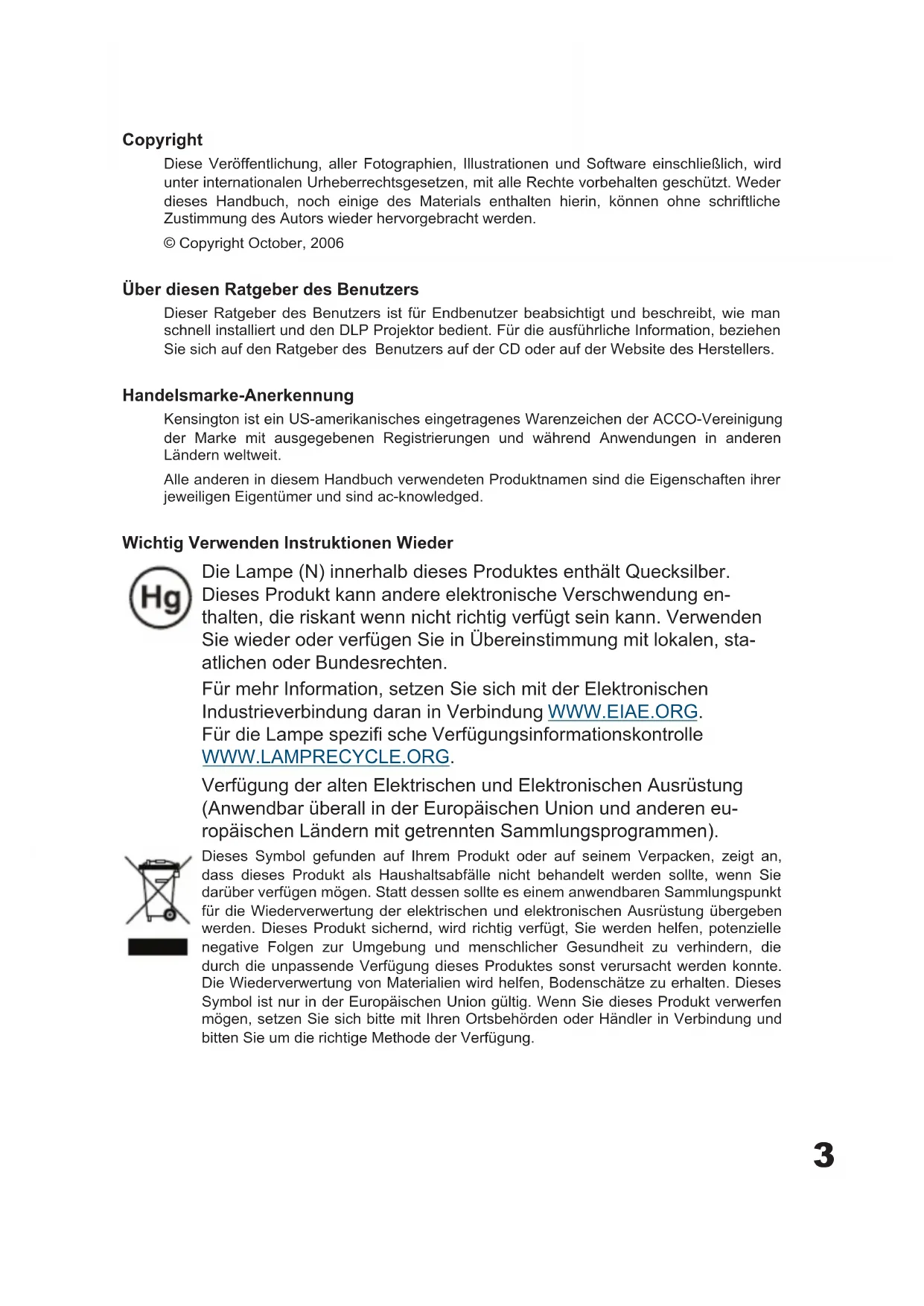 Planar Systems, Inc. Корпоративный Штаб 1195 NW Compton Drive, USA Beaverton, OR 97006-1992 Planar Поддержка Клиента Телефон: США: 1-866-PLANAR1 (866) 752-6271 Внутри США: +1 (503) 748-5799 E-mail: PlanarSupport@planar.com Онлайн Техническая Библиотека: http://www.planar.com/support Часы: M-F, 8am - 8pm ET, 12pm - 12am GMT3 Copyright Diese Veröffentlichung, aller Fotographien, Illustrationen und Software einschließlich, wird unter internationalen Urheberrechtsgesetzen, mit alle Rechte vorbehalten geschützt. Weder dieses Handbuch, noch einige des Materials enthalten hierin, können ohne schriftliche Zustimmung des Autors wieder hervorgebracht werden. © Copyright October, 2006 Über diesen Ratgeber des Benutzers Dieser Ratgeber des Benutzers ist für Endbenutzer beabsichtigt und beschreibt, wie man schnell installiert und den DLP Projektor bedient. Für die ausführliche Information, beziehen Sie sich auf den Ratgeber des Benutzers auf der CD oder auf der Website des Herstellers. Handelsmarke-Anerkennung Kensington ist ein US-amerikanisches eingetragenes Warenzeichen der ACCO-Vereinigung der Marke mit ausgegebenen Registrierungen und während Anwendungen in anderen Ländern weltweit. Alle anderen in diesem Handbuch verwendeten Produktnamen sind die Eigenschaften ihrer jeweiligen Eigentümer und sind ac-knowledged. Wichtig Verwenden Instruktionen Wieder Die Lampe (N) innerhalb dieses Produktes enthält Quecksilber. Dieses Produkt kann andere elektronische Verschwendung en- thalten, die riskant wenn nicht richtig verfügt sein kann. Verwenden Sie wieder oder verfügen Sie in Übereinstimmung mit lokalen, sta- atlichen oder Bundesrechten. Für mehr Information, setzen Sie sich mit der Elektronischen Industrieverbindung daran in Verbindung WWW.EIAE.ORG. Für die Lampe spezifi sche Verfügungsinformationskontrolle WWW.LAMPRECYCLE.ORG. Verfügung der alten Elektrischen und Elektronischen Ausrüstung (Anwendbar überall in der Europäischen Union und anderen eu- ropäischen Ländern mit getrennten Sammlungsprogrammen). Dieses Symbol gefunden auf Ihrem Produkt oder auf seinem Verpacken, zeigt an, dass dieses Produkt als Haushaltsabfälle nicht behandelt werden sollte, wenn Sie darüber verfügen mögen. Statt dessen sollte es einem anwendbaren Sammlungspunkt für die Wiederverwertung der elektrischen und elektronischen Ausrüstung übergeben werden. Dieses Produkt sichernd, wird richtig verfügt, Sie werden helfen, potenzielle negative Folgen zur Umgebung und menschlicher Gesundheit zu verhindern, die durch die unpassende Verfügung dieses Produktes sonst verursacht werden konnte. Die Wiederverwertung von Materialien wird helfen, Bodenschätze zu erhalten. Dieses Symbol ist nur in der Europäischen Union gültig. Wenn Sie dieses Produkt verwerfen mögen, setzen Sie sich bitte mit Ihren Ortsbehörden oder Händler in Verbindung und bitten Sie um die richtige Methode der Verfügung.4 Durchführungswarnungen Vor der Installation und dem Verwenden des Projektors, lesen Sie die Durchführungsbenach richtigungen im “Durchführungsgehorsam” Abteilung auf der Seite 45. Schreiben Sie Ihr Planares Produkt Heute Ein Dankt Ihnen, um Planar zu wählen. Um zu versichern, erhalten Sie alle Vorteile Ihres Planaren Produktes und Dienstleistungen, schreiben Ihr Planares Produkt heute ein. Besuchen Sie unsere Website: http://www.planar.com/support/product_registation.html Kabel, Ersatz-Lampen und Zusätze Kabel, Ersatz-Lampen und Zusätze für Ihren Planaren Projektor, Flüssigkristallanzeige- Monitor, Berührung - Schirm, oder andere Planare Produkte zu fi nden, besuchen unser On-Line-Lager: http://www.PlanarOnlone.com oder fi nden andere Lager dass Lager Planare Produkte daran http://www.planar.com/howtobuy.5