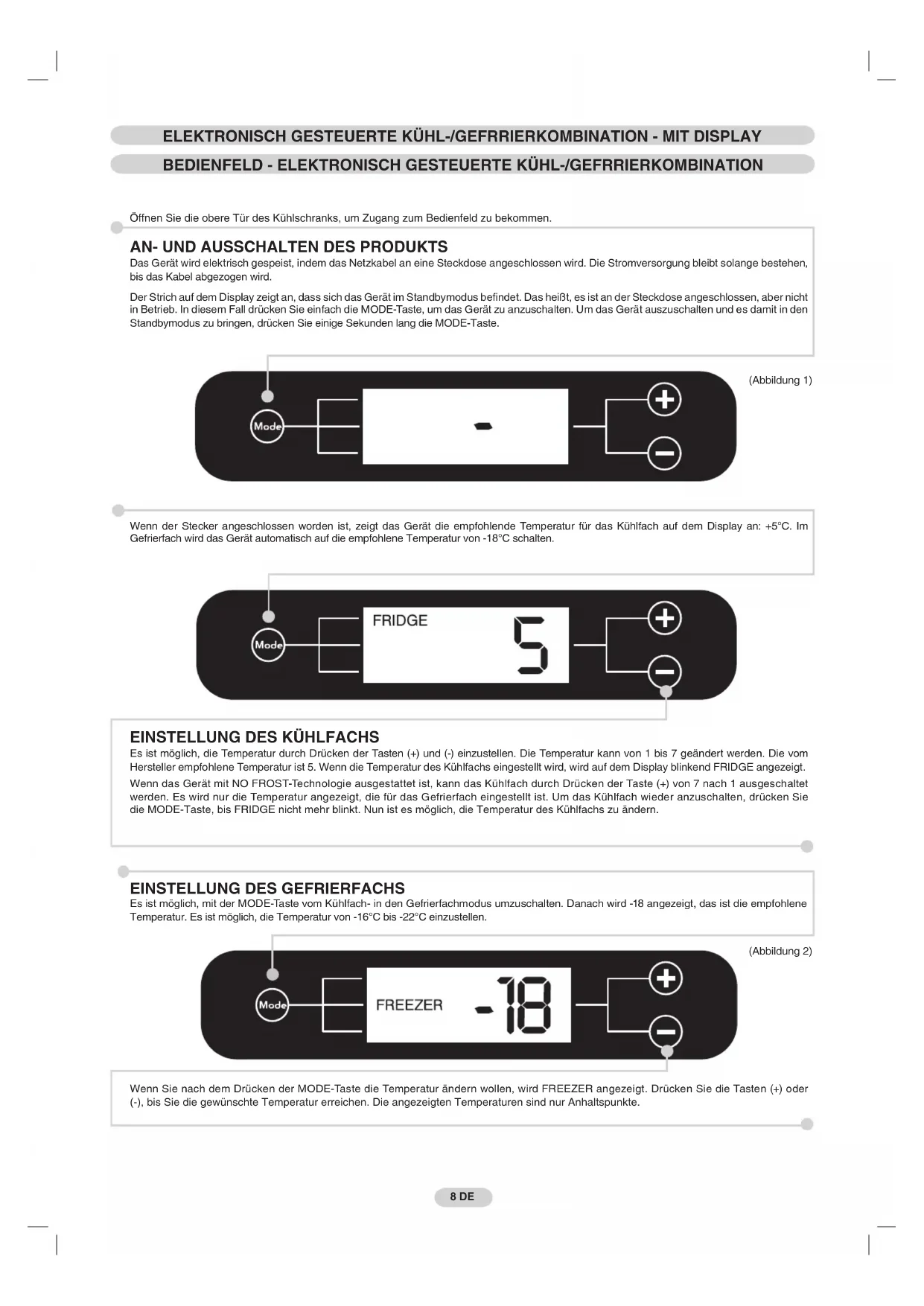 Es ist möglich, die Temperatur durch Drücken der Tasten (+) und (-) einzustellen. Die Temperatur kann von 1 bis 7 geändert werden. Die vom Hersteller empfohlene Temperatur ist 5. Wenn die Temperatur des Kühlfachs eingestellt wird, wird auf dem Display blinkend FRIDGE angezeigt. Wenn das Gerät mit NO FROST-Technologie ausgestattet ist, kann das Kühlfach durch Drücken der Taste (+) von 7 nach 1 ausgeschaltet werden. Es wird nur die Temperatur angezeigt, die für das Gefrierfach eingestellt ist. Um das Kühlfach wieder anzuschalten, drücken Sie die MODE-Taste, bis FRIDGE nicht mehr blinkt. Nun ist es möglich, die Temperatur des Kühlfachs zu ändern.