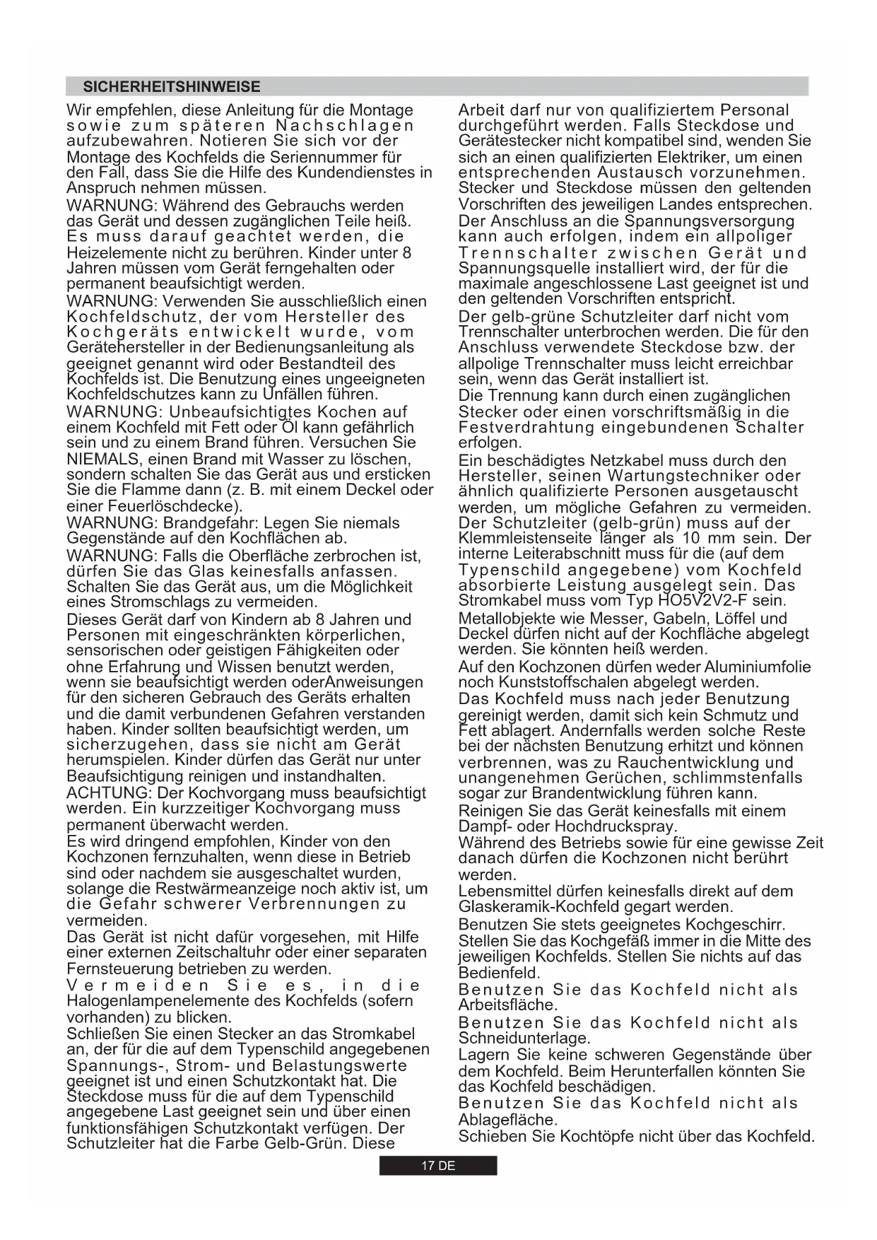 Die Installation eines Haushaltsgeräts kann unter Umständen eine komplexe Arbeit sein; wenn diese nicht korrekt ausgeführt wird, könnte es zu schweren Beeinträchtigungen der Sicherheit des Benutzers kommen. Das ist der Grund, warum sie von einem qualifizierten Fachmann unter Einhaltung der geltenden technischen Regeln durchgeführt werden soll. Falls diese Empfehlung nicht beachtet und die Installation des Gerätes durch eine nicht qualifizierte Person durchgeführt werden sollte, lehnt der Hersteller jede Verantwortung für eventuelle technische Fehler des Produktes ab, gleichviel, ob es zu Schäden an Personen oder Sachen führt. 2.1. ELEKTRISCHER ANSCHLUSS Überprüfen Sie die auf dem Matrikelschild angegebenen Daten. Das Matrikelschild befindet sich auf der unteren Seite des Gerätegehäuses. Notieren Sie alle Daten wie Matrikel- und Seriennummer am besten direkt auf dem Deckblatt der Bedienungsanleitung, da diese Angaben in einem eventuellen Servicefall vom Kundendienst benötigt werden. Überprüfen Sie, dass die Netzspannung und die Leistung für den Betrieb des Gerätes geeignet sind. Vor dem elektrischen Anschluss ist die einwandfreie Erdung der elektrischen Hausinstallation zu prüfen. Die Erdung des Gerätes ist gesetzlich vorgeschrieben. Der Hersteller weist jede Verantwortung für Sach- oder Personenschäden zurück, die auf fehlende bzw. mangelhafte Erdung zurückzuführen sind. Bei den Modellen, die ohne Stecker geliefert werden, ist ein genormter Stecker an das Kabel zu montieren, welcher für die auf das Matrikelschild angegebene Belastung geeignet ist. Der Erdleiter ist durch das gelb-grüne Kabel gekennzeichnet. Der Stecker muss in jedem Fall zugänglich sein. Soll das Gerät an einer festen Anschlussdose angeschlossen werden, ist zwischen dem Gerät und dem Versorgungsnetz eine der Last entsprechende, genormteAbschaltvorrichtung einzubauen. Sollte das Netzkabel beschädigt sein, muss dieser durch einen qualifizierten Fachmann ausgewechselt werden. Der gelb-grüne Erdleiter muss mindestens 10 mm länger sein als die Phasenleiter. Der Querschnitt der Kabel muss der Leistung der Kochmulde entsprechen (s. Matrikelschild). Benutzen Sie ausschließlich ein Netzkabel des Typs 3x0.75 mm² H05V2V2-F. PHASE ERDE NULL