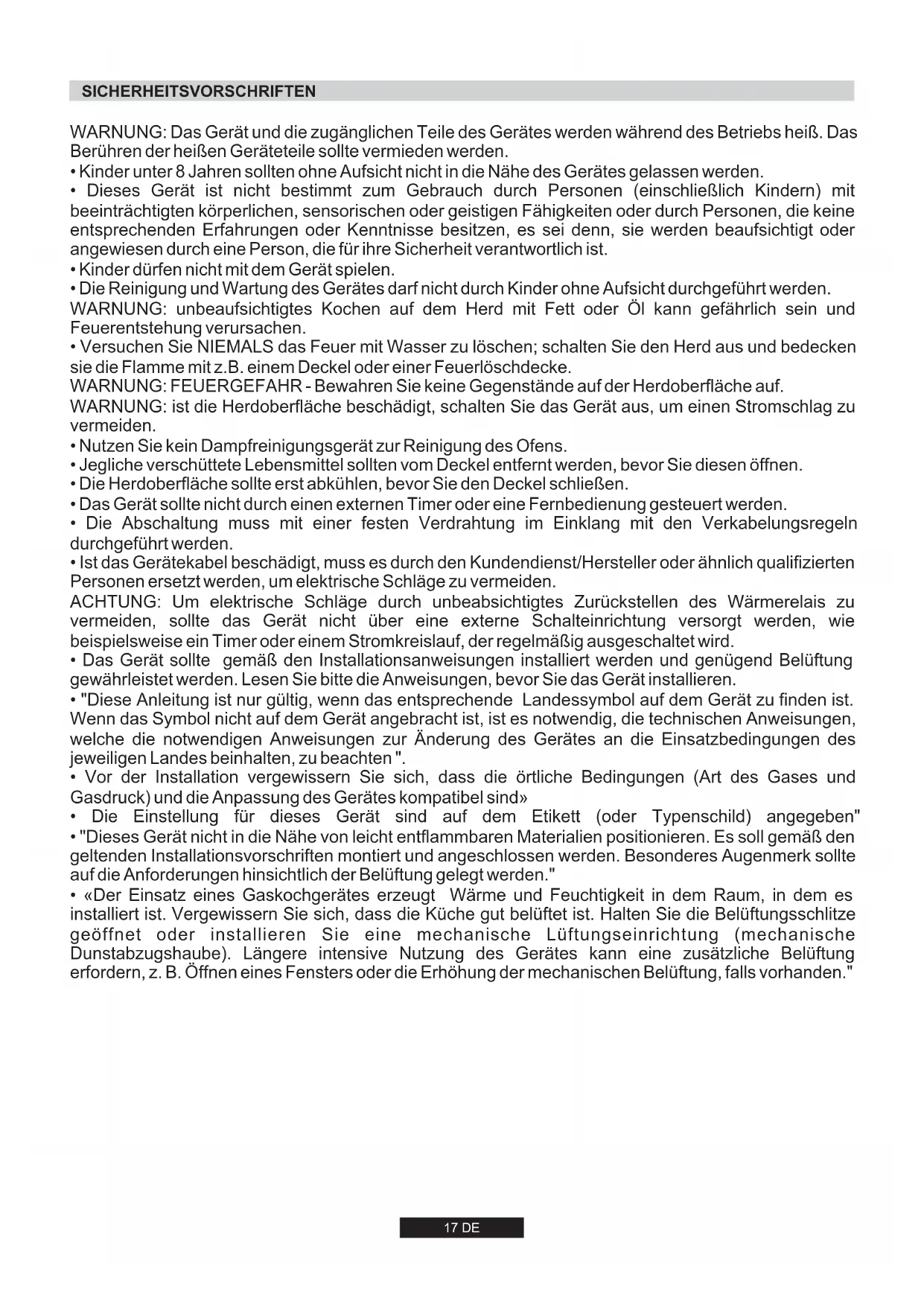 - «Der Einsatz eines Gaskochgerätes erzeugt Wärme und Feuchtigkeit in dem Raum, in dem es installiert ist. Vergewissern Sie sich, dass die Küche gut belüftet ist. Halten Sie die Belüftungsschlitze geöffnet oder installieren Sie eine mechanische Lüftungseinrichtung (mechanische Dunstabzugshaube). Längere intensive Nutzung des Gerätes kann eine zusätzliche Belüftung erfordern, z. B. Öffnen eines Fensters oder die Erhöhung der mechanischen Belüftung, falls vorhanden."18 DE