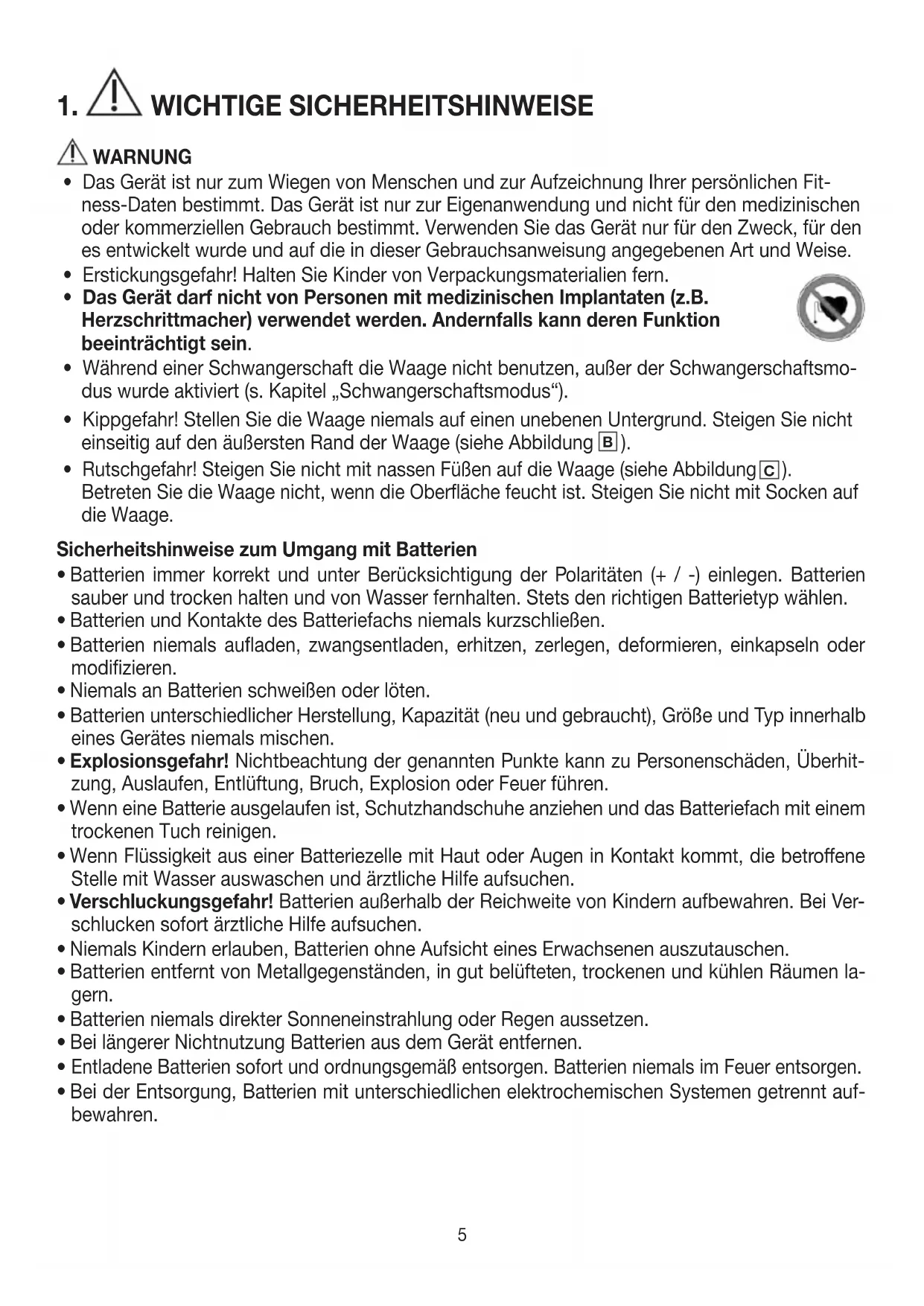 Betreten Sie die Waage nicht, wenn die Oberfläche feucht ist. Steigen Sie nicht mit Socken auf die Waage. Sicherheitshinweise zum Umgang mit Batterien