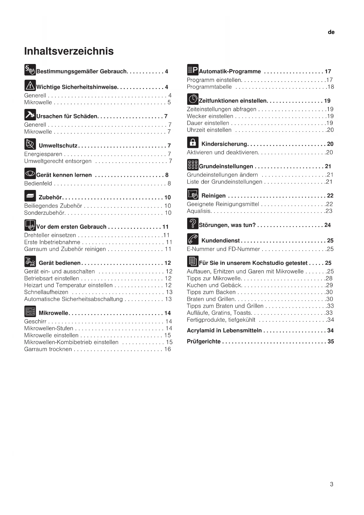 - Gerät kennen lernen . . . . . . . . . . . . . . . . . . . . . . 8 Bedienfeld . . . . . . . . . . . . . . . . . . . . . . . . . . . . . . . . . . 8 _ Zubehör. . . . . . . . . . . . . . . . . . . . . . . . . . . . . . . . 10 Beiliegendes Zubehör . . . . . . . . . . . . . . . . . . . . . . . . 10 Sonderzubehör. . . . . . . . . . . . . . . . . . . . . . . . . . . . . . 10 K Vor dem ersten Gebrauch . . . . . . . . . . . . . . . . . 11 Drehteller einsetzen . . . . . . . . . . . . . . . . . . . . . . . . . .11 Erste Inbetriebnahme . . . . . . . . . . . . . . . . . . . . . . . . . 11 Garraum und Zubehör reinigen . . . . . . . . . . . . . . . . . 11 1 Gerät bedienen. . . . . . . . . . . . . . . . . . . . . . . . . . 12 Gerät ein- und ausschalten . . . . . . . . . . . . . . . . . . . . 12 Betriebsart einstellen . . . . . . . . . . . . . . . . . . . . . . . . . 12 Heizart und Temperatur einstellen . . . . . . . . . . . . . . . 12 Schnellaufheizen . . . . . . . . . . . . . . . . . . . . . . . . . . . . 13 Automatische Sicherheitsabschaltung . . . . . . . . . . . . 13 ^ Mikrowelle. . . . . . . . . . . . . . . . . . . . . . . . . . . . . . 14 Geschirr . . . . . . . . . . . . . . . . . . . . . . . . . . . . . . . . . . . 14 Mikrowellen-Stufen . . . . . . . . . . . . . . . . . . . . . . . . . . . 14 Mikrowelle einstellen . . . . . . . . . . . . . . . . . . . . . . . . . 15 Mikrowellen-Kombibetrieb einstellen . . . . . . . . . . . . . 15 Garraum trocknen . . . . . . . . . . . . . . . . . . . . . . . . . . . 16 P Automatik-Programme . . . . . . . . . . . . . . . . . . . 17 Programm einstellen. . . . . . . . . . . . . . . . . . . . . . . . . .17 Programmtabelle . . . . . . . . . . . . . . . . . . . . . . . . . . . .18 O Zeitfunktionen einstellen. . . . . . . . . . . . . . . . . . 19 Zeiteinstellungen abfragen . . . . . . . . . . . . . . . . . . . . .19 Wecker einstellen . . . . . . . . . . . . . . . . . . . . . . . . . . . .19 Dauer einstellen . . . . . . . . . . . . . . . . . . . . . . . . . . . . .19 Uhrzeit einstellen . . . . . . . . . . . . . . . . . . . . . . . . . . . .20 A Kindersicherung. . . . . . . . . . . . . . . . . . . . . . . . . 20 Aktivieren und deaktivieren. . . . . . . . . . . . . . . . . . . . .20 Q Grundeinstellungen . . . . . . . . . . . . . . . . . . . . . . 21 Grundeinstellungen ändern . . . . . . . . . . . . . . . . . . . .21 Liste der Grundeinstellungen . . . . . . . . . . . . . . . . . . .21 D Reinigen . . . . . . . . . . . . . . . . . . . . . . . . . . . . . . . 22 Geeignete Reinigungsmittel . . . . . . . . . . . . . . . . . . . .22 Aqualisis. . . . . . . . . . . . . . . . . . . . . . . . . . . . . . . . . . .23 3 Störungen, was tun? . . . . . . . . . . . . . . . . . . . . . 24 4 Kundendienst . . . . . . . . . . . . . . . . . . . . . . . . . . . 25 E-Nummer und FD-Nummer . . . . . . . . . . . . . . . . . . . .25 J Für Sie in unserem Kochstudio getestet . . . . . 25 Auftauen, Erhitzen und Garen mit Mikrowelle . . . . . . .25 Tipps zur Mikrowelle. . . . . . . . . . . . . . . . . . . . . . . . . .28 Kuchen und Gebäck. . . . . . . . . . . . . . . . . . . . . . . . . .29 Tipps zum Backen . . . . . . . . . . . . . . . . . . . . . . . . . . .30 Braten und Grillen. . . . . . . . . . . . . . . . . . . . . . . . . . . .30 Tipps zum Braten und Grillen . . . . . . . . . . . . . . . . . . .33 Aufläufe, Gratins, Toasts. . . . . . . . . . . . . . . . . . . . . . .33 Fertigprodukte, tiefgekühlt . . . . . . . . . . . . . . . . . . . . .34 Acrylamid in Lebensmitteln . . . . . . . . . . . . . . . . . . . . 34 Prüfgerichte . . . . . . . . . . . . . . . . . . . . . . . . . . . . . . . . . 35de Bestimmungsgemäßer Gebrauch