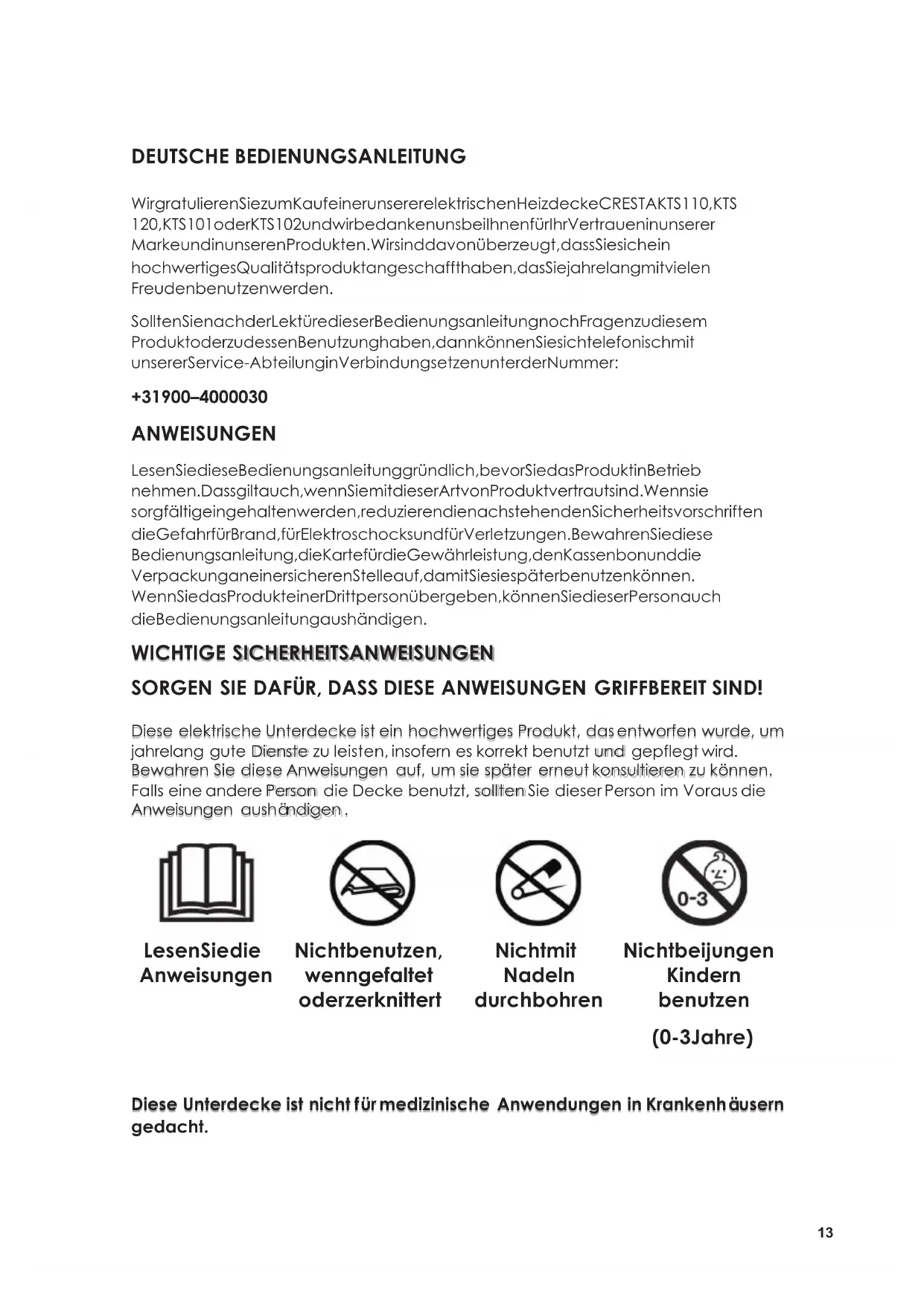 PRINTING PRINTING ERRORS ERRORS AND AND MODIFICATIONS MODIFICATIONS RESERVED RESERVED DEUTSCHE DEUTSCHE BEDIENUNGSANLEITUNG BEDIENUNGSANLEITUNG Wir gratulieren Sie zum Kauf einer unserer elektrischen Heizdecke CRESTA KTS 110, KTS 120, KTS 101 oder KTS 102 und wir bedanken uns bei Ihnen für Ihr Vertrauen in unserer Marke und in unseren Produkten. Wir sind davon überzeugt, dass Sie sich ein hochwertiges Qualitätsprodukt angeschafft haben, das Sie jahrelang mit vielen Freuden benutzen werden. Sollten Sie nach der Lektüre dieser Bedienungsanleitung noch Fragen zu diesem Produkt oder zu dessen Benutzung haben, dann können Sie sich telefonisch mit unserer Service-Abteilung in Verbindung setzen unter der Nummer: + 31 900 – 4000030 ANWEISU NGEN Lesen Sie diese Bedienungsanleitung gründlich, bevor Sie das Produkt in Betrieb nehmen. Dass gilt auch, wenn Sie mit dieser Art von Produkt vertraut sind. Wenn sie sorgfältig eingehalten werden, reduzieren die nachstehenden Sicherheitsvorschriften die Gefahr für Brand, für E lektroschocks und für Verletzungen. Bewahren Sie diese Bedienungsanleitung, die Karte für die Gewährleistung, den Kassenbon und die Verpackung an einer sicheren Stelle auf, damit Sie sie später benutzen können. Wenn Sie d as Produkt einer Drittperson übergeben, können Sie dieser Person auch die Bedienungsanleitung aushändigen. WICHTIGE WICHTIGE SICHERHEITSANWEISUNGEN SICHERHEITSANWEISUNGEN SORGEN SORGEN SIE SIE DAF DAF