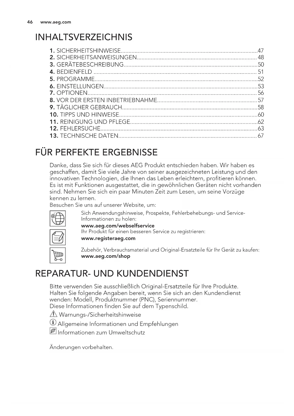 Bitte verwenden Sie ausschließlich Original-Ersatzteile für Ihre Produkte. Halten Sie folgende Angaben bereit, wenn Sie sich an den Kundendienst wenden: Modell, Produktnummer (PNC), Seriennummer. Diese Informationen finden Sie auf dem Typenschild. Warnungs-/Sicherheitshinweise Allgemeine Informationen und Empfehlungen Informationen zum Umweltschutz Änderungen vorbehalten. www.aeg.com