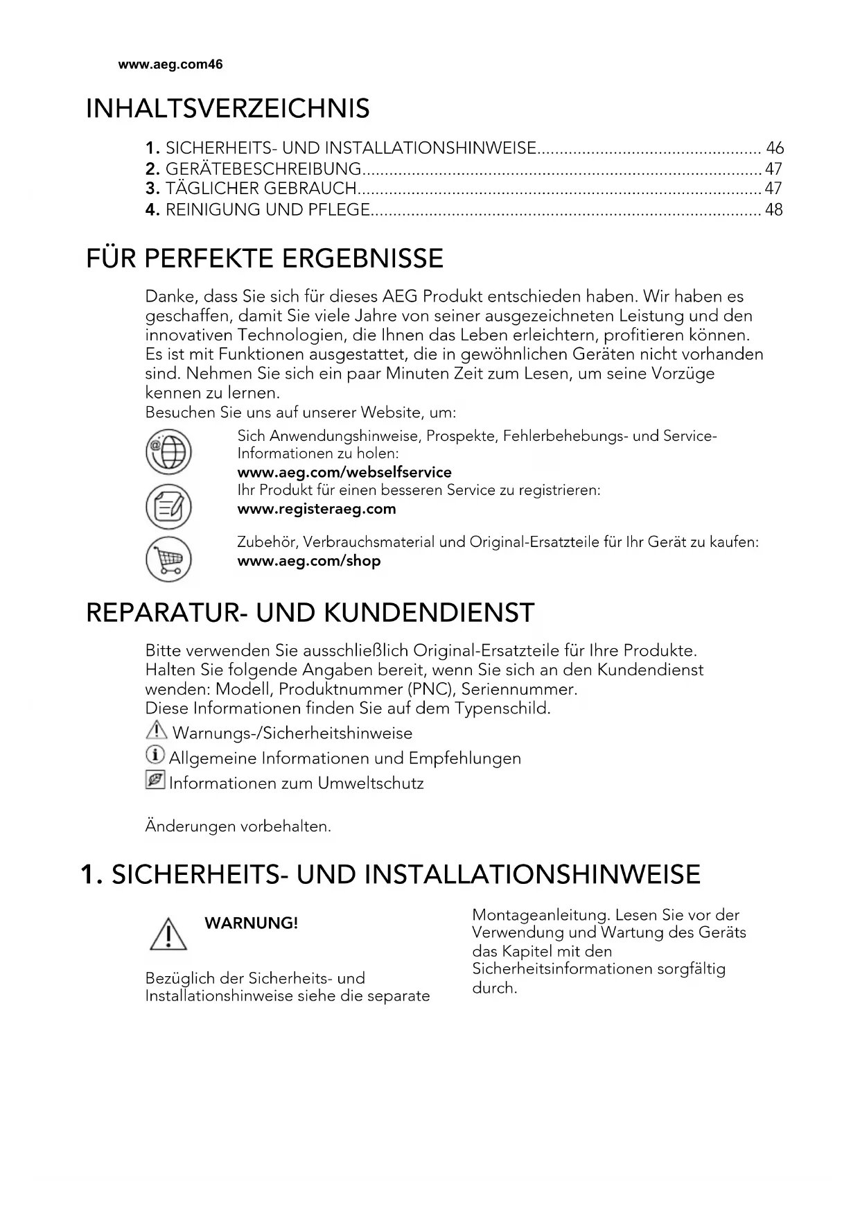 Danke, dass Sie sich für dieses AEG Produkt entschieden haben. Wir haben es geschaffen, damit Sie viele Jahre von seiner ausgezeichneten Leistung und den innovativen Technologien, die Ihnen das Leben erleichtern, profitieren können. Es ist mit Funktionen ausgestattet, die in gewöhnlichen Geräten nicht vorhanden sind. Nehmen Sie sich ein paar Minuten Zeit zum Lesen, um seine Vorzüge kennen zu lernen. Besuchen Sie uns auf unserer Website, um: Sich Anwendungshinweise, Prospekte, Fehlerbehebungs- und Service- Informationen zu holen: www.aeg.com/webselfservice Ihr Produkt für einen besseren Service zu registrieren: www.registeraeg.com Zubehör, Verbrauchsmaterial und Original-Ersatzteile für Ihr Gerät zu kaufen: www.aeg.com/shop