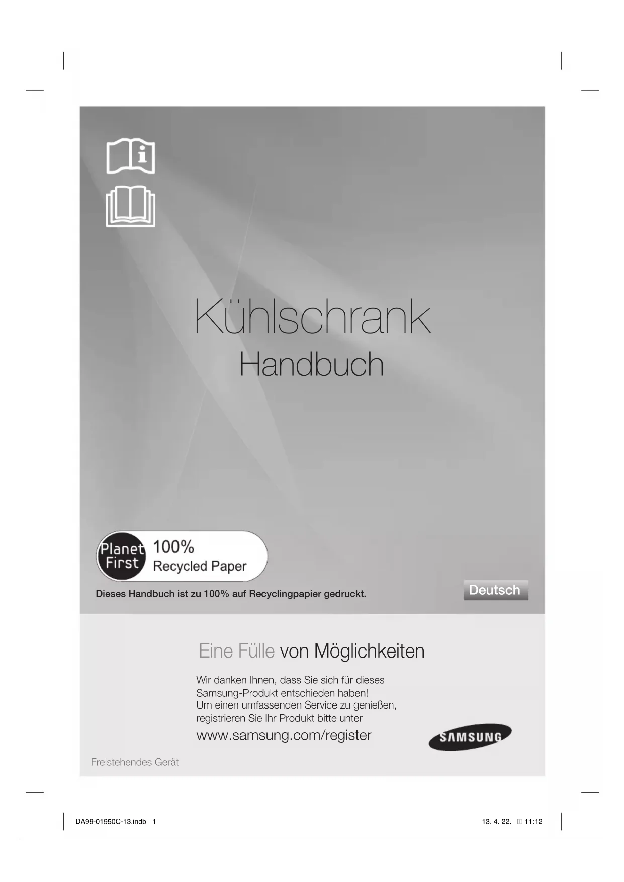 DA99-01950C-13.indb 2:20DA99-01950C-13.indb 2:20 13. 4. 22. 11:1213. 4. 22. 11:12memo DA99-01950C-13.indb 2:21DA99-01950C-13.indb 2:21 13. 4. 22. 11:1213. 4. 22. 11:12Raumtemperaturbereich (Klimaklassen) Die Kühl-Gefrier-Kombination ist für einen Betrieb bei Raumtemperaturen entsprechend der auf dem Typenschild angegebenen Klimaklasse ausgelegt. Klimaklasse Symbol Raumtemperaturbereich (°C) Kalt gemäßigt (subnormal) SN +10 bis +32 Warm gemäßigt (normal) N +16 bis +32 Suptropisch ST +16 bis +38 Tropisch T +16 bis +43 Die Temperaturen im Geräteinnern werden von verschiedenen Faktoren beeinfl usst, wie.B. dem Aufstellort, der Raumtemperatur und wie häufi g die Gerätetür geöffnet wird. Stellen Sie die Temperatur wie angegeben ein, um so diese Faktoren zu kompensieren. Kontakt zu Samsung Falls Sie Fragen oder Anregungen zu Samsung-Produkten haben, wenden Sie sich bitte an den Samsung-Kundendienst. Samsung Electronics GmbH, Am Kronberger Hang 6, 65824 Schwalbach/Taunus 0180 5 SAMSUNG bzw. 0180 5 7267864* (*0,14 €/Min. aus dem dt. Festnetz, aus dem Mobilfunk max. 0,42 €/Min.) www.samsung.com Deutsch Korrekte Entsorgung von Altgeräten (Elektroschrott) (Gilt für Länder mit Abfalltrennsystemen) Die Kennzeichnung auf dem Produkt, Zubehörteilen bzw. auf der dazugehörigen Dokumentation gibt an, dass das Produkt und Zubehörteile (z. B. Ladegerät, Kopfhörer, USB- Kabel) nach ihrer Lebensdauer nicht zusammen mit dem normalen Haushaltsmüll entsorgt werden dürfen. Entsorgen Sie dieses Gerät und Zubehörteile bitte getrennt von anderen Abfällen, um der Umwelt bzw. der menschlichen Gesundheit nicht durch unkontrollierte Müllbeseitigung zu schaden. Helfen Sie mit, das Altgerät und Zubehörteile fachgerecht zu entsorgen, um die nachhaltige Wiederverwertung von stoffl ichen Ressourcen zu fördern. Private Nutzer wenden sich an den Händler, bei dem das Produkt gekauft wurde, oder kontaktieren die zuständigen Behörden, um in Erfahrung zu bringen, wo Sie das Altgerät bzw. Zubehörteile für eine umweltfreundliche Entsorgung abgeben können. Gewerbliche Nutzer wenden sich an ihren Lieferanten und gehen nach den Bedingungen des Verkaufsvertrags vor. Dieses Produkt und elektronische Zubehörteile dürfen nicht zusammen mit anderem Gewerbemüll entsorgt werden. DA99-01950C-13.indb 2:22DA99-01950C-13.indb 2:22 13. 4. 22. 11:1213. 4. 22. 11:12Vrijstaand apparaat Koelkast gebruiksaanwijzing wat een mogelijkheden Hartelijk dank voor de aanschaf van dit Samsung-product.Voor aanvullende service kunt u uw product registreren op de website: www.samsung.com/register Nederlands Deze handleiding is gemaakt van 100% gerecycled papier. DA99-01950C-13.indb 1DA99-01950C-13.indb 1 13. 4. 22. 11:1213. 4. 22. 11:122_ veiligheidsinformatie VEILIGHEIDSINFORMATIE