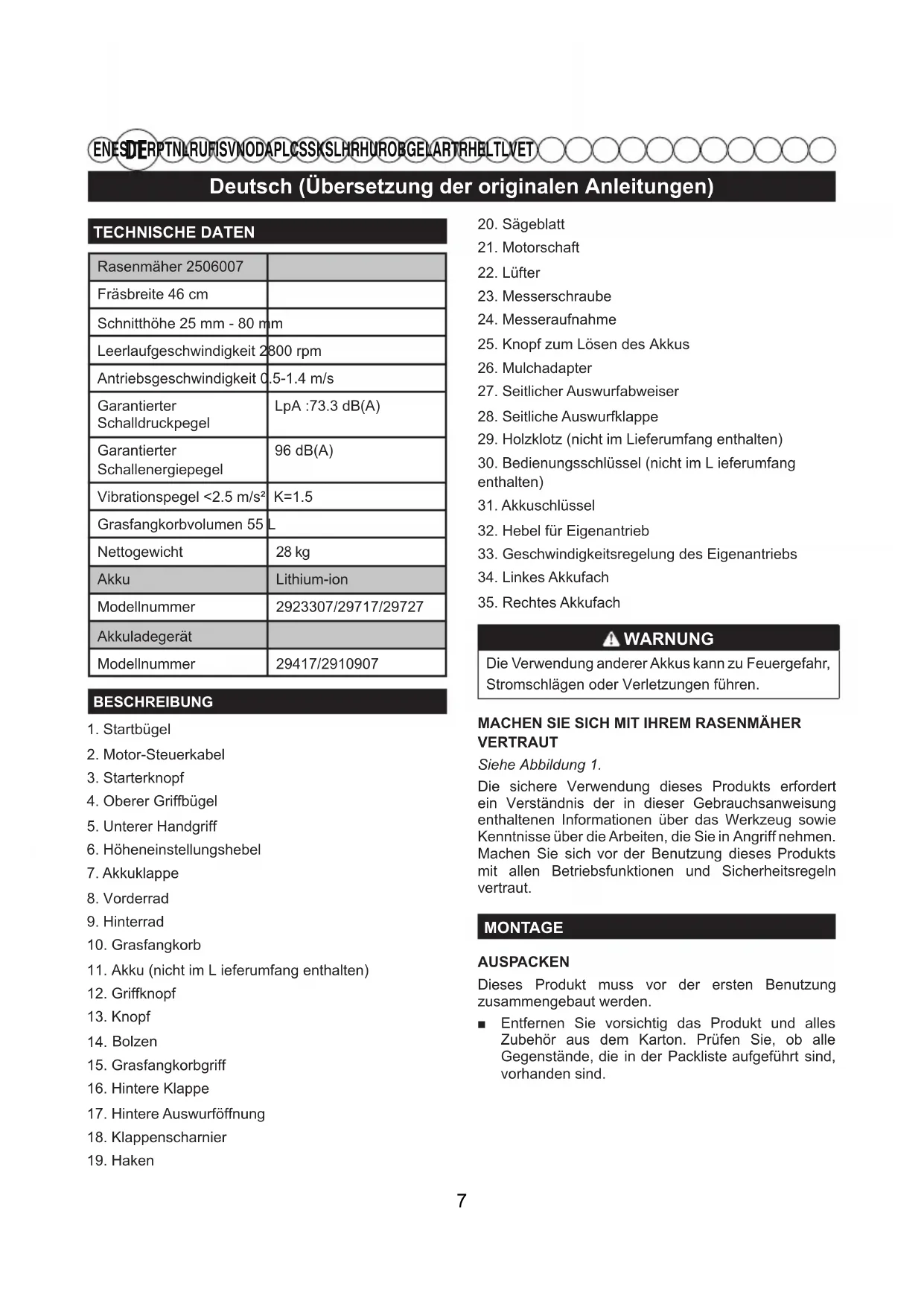 EN ES IT FR PT NL RU FI SV NO DA PL CS SK SL HR HU RO BG EL AR TR HE LT LV ET TECHNISCHE DATENRasenmäher 2506007Fräsbreite 46 cmSchnitthöhe 25 mm - 80 mmLeerlaufgeschwindigkeit 2800 rpmAntriebsgeschwindigkeit 0.5-1.4 m/sGarantierter SchalldruckpegelLpA :73.3 dB(A)GarantierterSchallenergiepegel96 dB(A)Vibrationspegel <2.5 m/s², K=1.5Grasfangkorbvolumen 55 LNettogewicht 28 kgAkku Lithium-ionModellnummer 2923307/29717/29727AkkuladegerätModellnummer 29417/2910907BESCHREIBUNG1. Startbügel2. Motor-Steuerkabel3. Starterknopf4. Oberer Griffbügel5. Unterer Handgriff6. Höheneinstellungshebel7. Akkuklappe8. Vorderrad9. Hinterrad10. Grasfangkorb11. Akku (nicht im L ieferumfang enthalten)12. Griffknopf13. Knopf Bolzen15. Grasfangkorbgriff16. Hintere Klappe17. Hintere Auswurföffnung18. Klappenscharnier19. Haken20. Sägeblatt21. Motorschaft22. Lüfter23. Messerschraube24. Messeraufnahme25. Knopf zum Lösen des Akkus26. Mulchadapter27. Seitlicher Auswurfabweiser28. Seitliche Auswurfklappe29. Holzklotz (nicht im Lieferumfang enthalten)30. Bedienungsschlüssel (nicht im L ieferumfang enthalten)31. Akkuschlüssel32. Hebel für Eigenantrieb 33. Geschwindigkeitsregelung des Eigenantriebs34. Linkes Akkufach35. Rechtes Akkufach WARNUNG Die Verwendung anderer Akkus kann zu Feuergefahr, Stromschlägen oder Verletzungen führen. MACHEN SIE SICH MIT IHREM RASENMÄHER VERTRAUTSiehe Abbildung 1.Die sichere Verwendung dieses Produkts erfordert ein Verständnis der in dieser Gebrauchsanweisung enthaltenen Informationen über das Werkzeug sowie Kenntnisse über die Arbeiten, die Sie in Angriff nehmen. Machen Sie sich vor der Benutzung dieses Produkts mit allen Betriebsfunktionen und Sicherheitsregeln vertraut.MONTAGEAUSPACKEN Dieses Produkt muss vor der ersten Benutzung zusammengebaut werden. ■ Entfernen Sie vorsichtig das Produkt und alles Zubehör aus dem Karton. Prüfen Sie, ob alle Gegenstände, die in der Packliste aufgeführt sind, vorhanden sind. 7Deutsch (Übersetzung der originalen Anleitungen)
