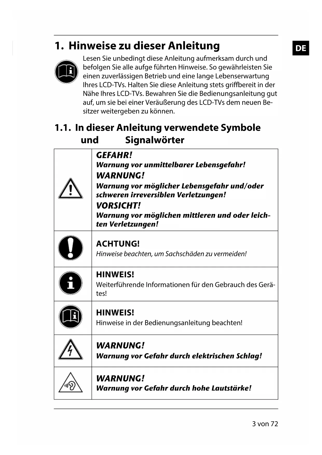 Lesen Sie unbedingt diese Anleitung aufmerksam durch und befolgen Sie alle aufge führten Hinweise. So gewährleisten Sie einen zuverlässigen Betrieb und eine lange Lebenserwartung Ihres LCD-TVs. Halten Sie diese Anleitung stets griffbereit in der Nähe Ihres LCD-TVs. Bewahren Sie die Bedienungsanleitung gut auf, um sie bei einer Veräußerung des LCD-TVs dem neuen Be- sitzer weitergeben zu können. 1.1. In dieser Anleitung verwendete Symbole und Signalwörter GEFAHR! Warnung vor unmittelbarer Lebensgefahr! WARNUNG! Warnung vor möglicher Lebensgefahr und/oder schweren irreversiblen Verletzungen! VORSICHT! Warnung vor möglichen mittleren und oder leich- ten Verletzungen! ACHTUNG! Hinweise beachten, um Sachschäden zu vermeiden! HINWEIS! Weiterführende Informationen für den Gebrauch des Gerä- tes! HINWEIS! Hinweise in der Bedienungsanleitung beachten! WARNUNG! Warnung vor Gefahr durch elektrischen Schlag! WARNUNG! Warnung vor Gefahr durch hohe Lautstärke!4 von 72