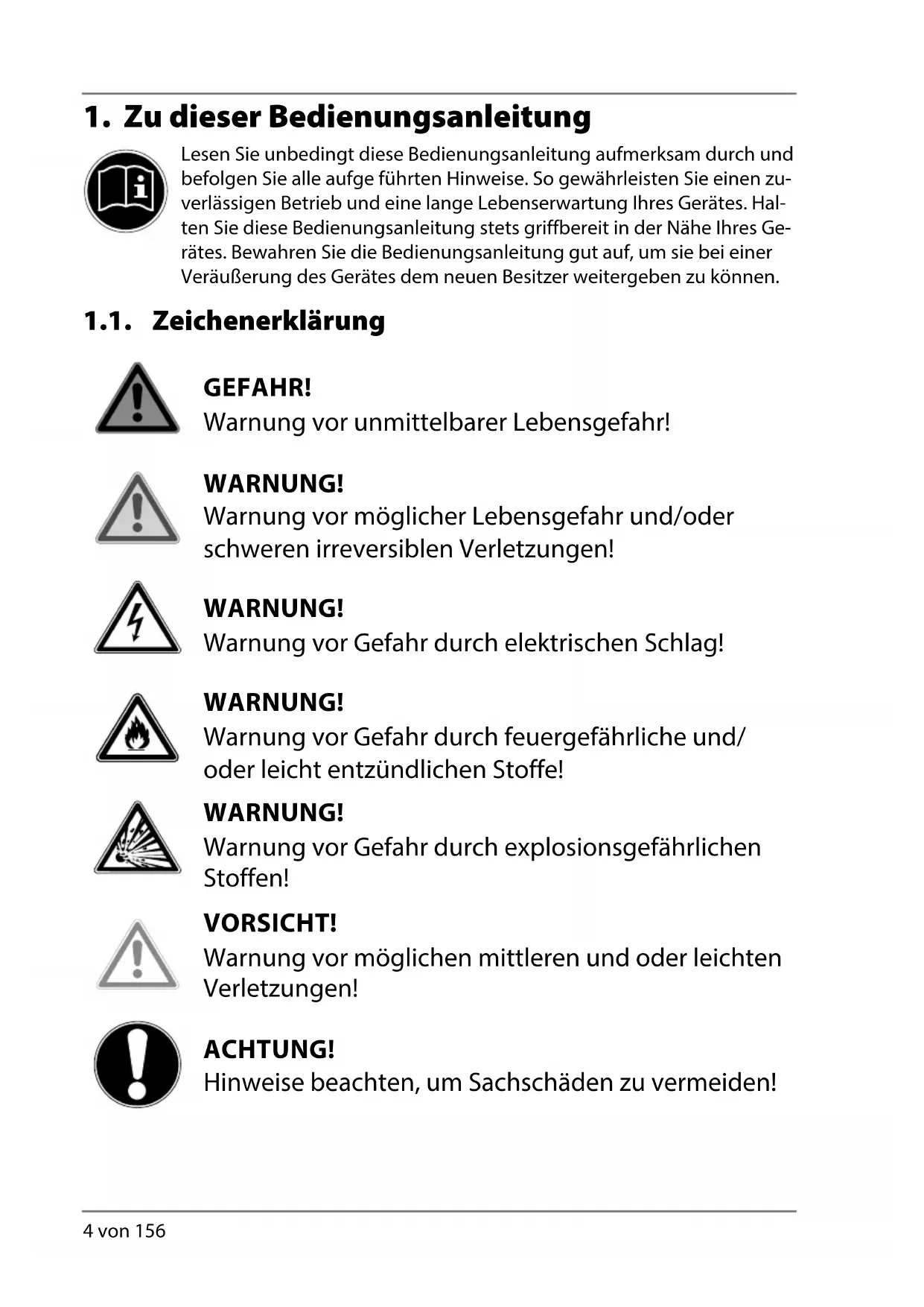 3 von 1561. Zu dieser Bedienungsanleitung Lesen Sie unbedingt diese Bedienungsanleitung aufmerksam durch und befolgen Sie alle aufge führten Hinweise. So gewährleisten Sie einen zu- verlässigen Betrieb und eine lange Lebenserwartung Ihres Gerätes. Hal- ten Sie diese Bedienungsanleitung stets griffbereit in der Nähe Ihres Ge- rätes. Bewahren Sie die Bedienungsanleitung gut auf, um sie bei einer Veräußerung des Gerätes dem neuen Besitzer weitergeben zu können. 1.1. Zeichenerklärung GEFAHR! Warnung vor unmittelbarer Lebensgefahr! WARNUNG! Warnung vor möglicher Lebensgefahr und/oder schweren irreversiblen Verletzungen! WARNUNG! Warnung vor Gefahr durch elektrischen Schlag! WARNUNG! Warnung vor Gefahr durch feuergefährliche und/ oder leicht entzündlichen Stoffe! WARNUNG! Warnung vor Gefahr durch explosionsgefährlichen Stoffen! VORSICHT! Warnung vor möglichen mittleren und oder leichten Verletzungen! ACHTUNG! Hinweise beachten, um Sachschäden zu vermeiden! 4 von 156HINWEIS! Weiterführende Informationen für den Gebrauch des Gerätes! HINWEIS! Hinweise in der Bedienungsanleitung beachten!