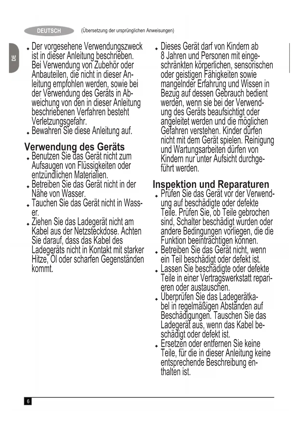 Achtung! Beachten Sie beim Umgang mit akkubetriebenen Geräten stets die grundlegenden Sicherheitshinweise, einschließlich der folgenden. Dadurch verhindern Sie weitgehend das Entstehen von Bränden, das Auslaufen von Akkus sowie Sach- und Personen- schäden. Lesen Sie diese Anleitung vollständig und aufmerksam durch, bevor Sie das Gerät zum ersten Mal verwenden.6 (Übersetzung der ursprünglichen Anweisungen) DEUTSCH